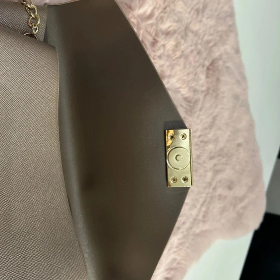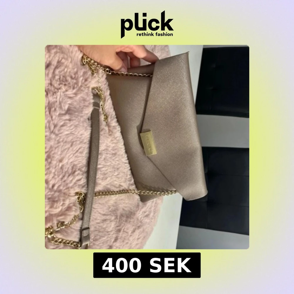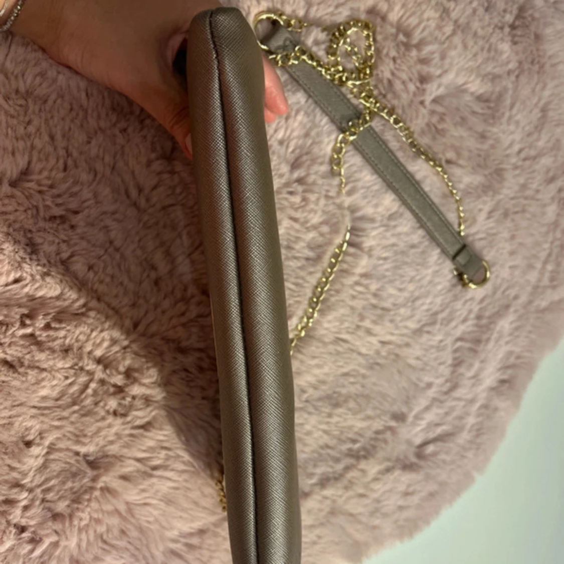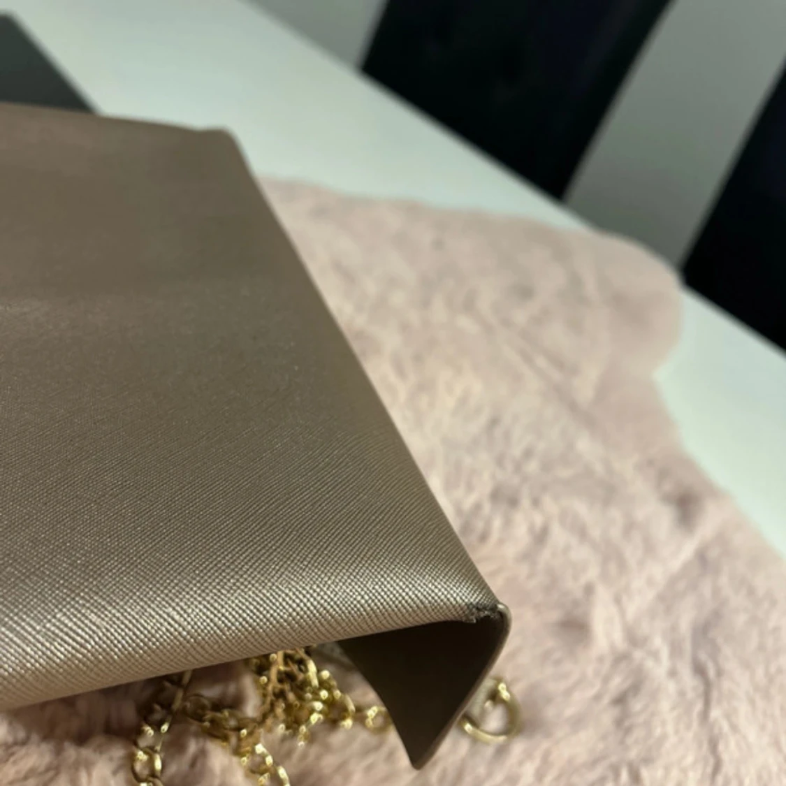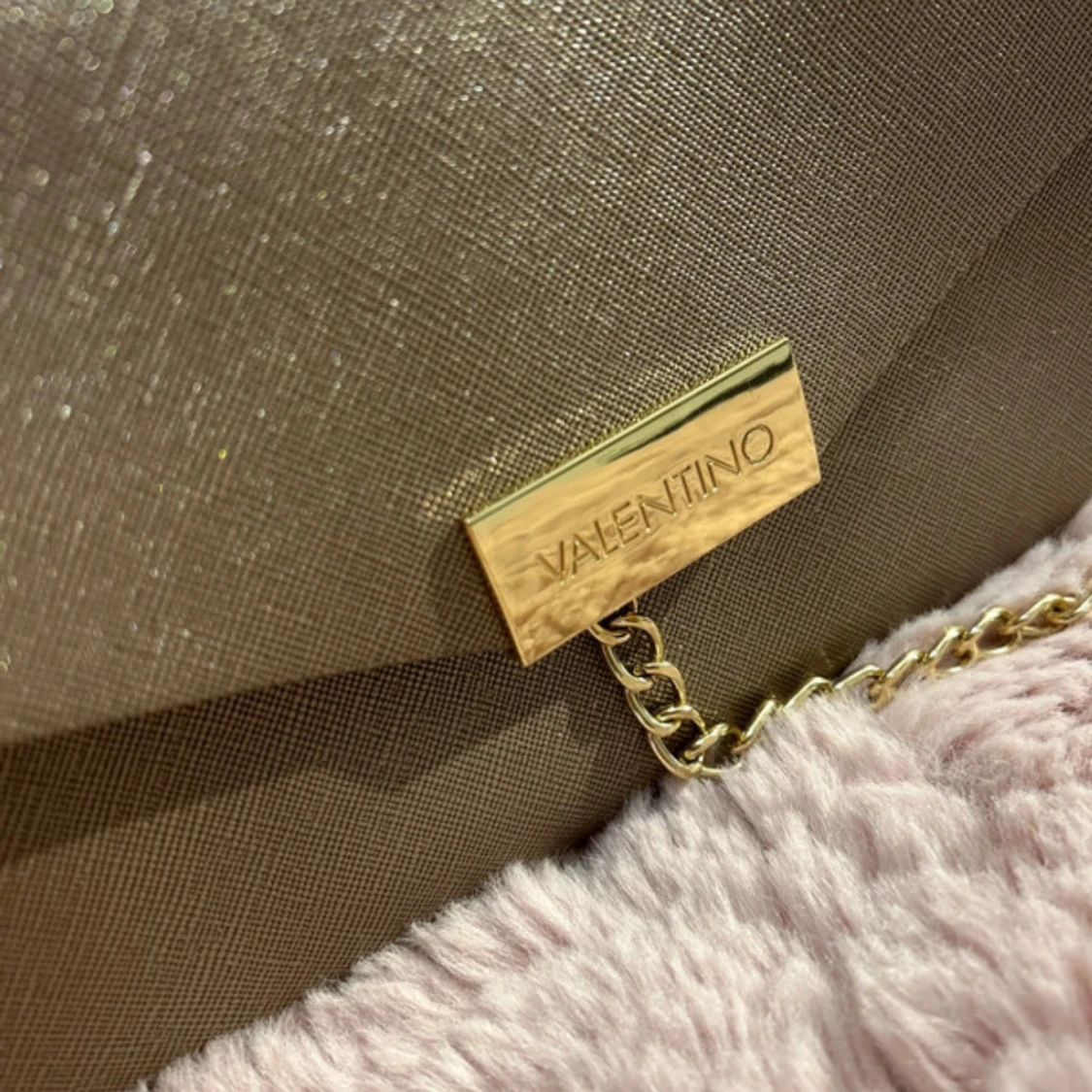 Stilren beige kuvertväska från Valentino med guldfärgad kedja och magnetlås. Väskan har en elegant, slät yta och klassisk triangelformad flärp framtill. Perfekt att bära crossbody eller i handen för en chic look.