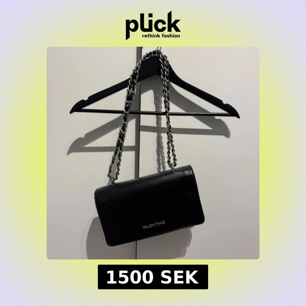 Stilren svart axelväska från Valentino i slätt skinn med silverfärgad kedjerem och logga framtill. Väskan har en klassisk rektangulär form och stängs med magnetlås. Perfekt för dig som gillar en clean och lyxig look.