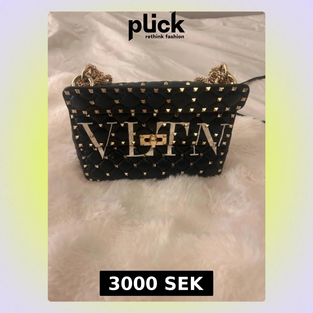 Snygg svart axelväska från Valentino med stora VLTN-bokstäver framtill. Väskan är quiltad i skinn och dekorerad med guldiga nitar och kedja. Låsdetalj i guld och cool design som sticker ut. Perfekt för dig som vill ha en statementväska.