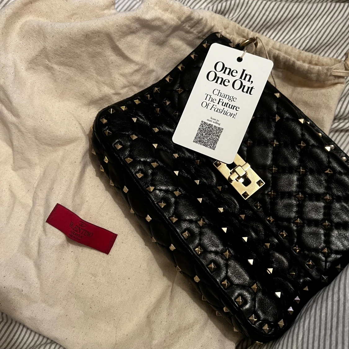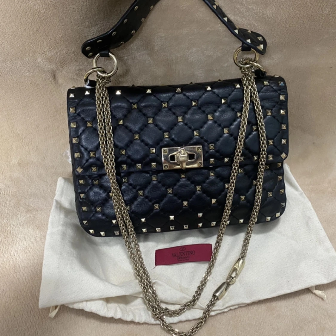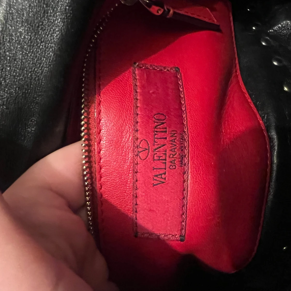 Skit snygg valentino garavani väska med svart läder och sen guldiga nitar. Köpt på Vestiaire collective så har deras äkthesgaranti men inget fysiskt kvitto. I mellan storleken. Använd men i otroligt fint skick. Det är mest metall delarna som kan ha små slitningar!😊❤️har fler bilder på serienummer inuti om man vill ha! Annars är det bara att fråga så kan jag skicka fler bilder