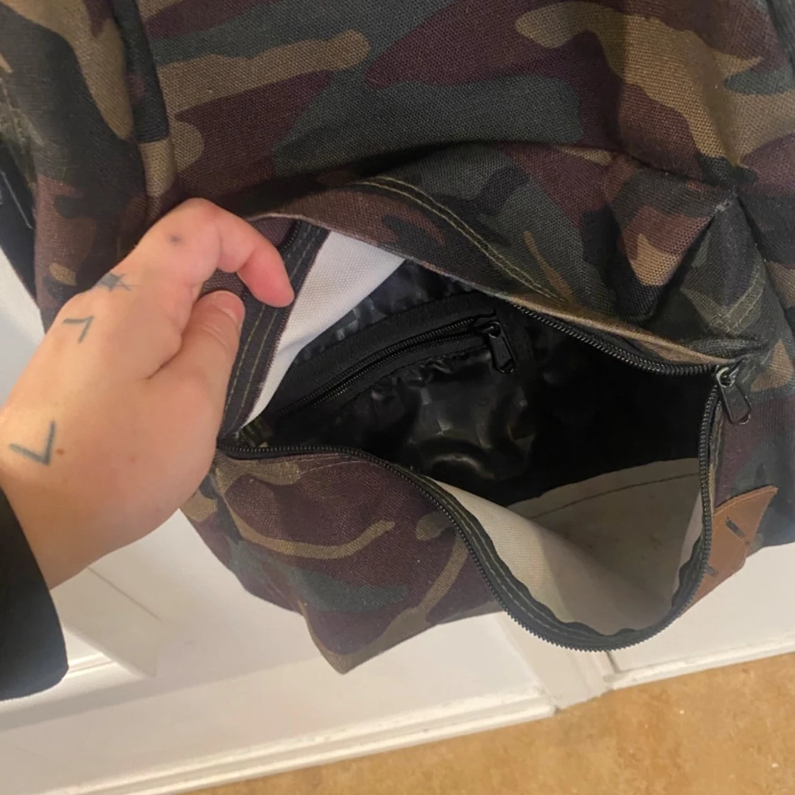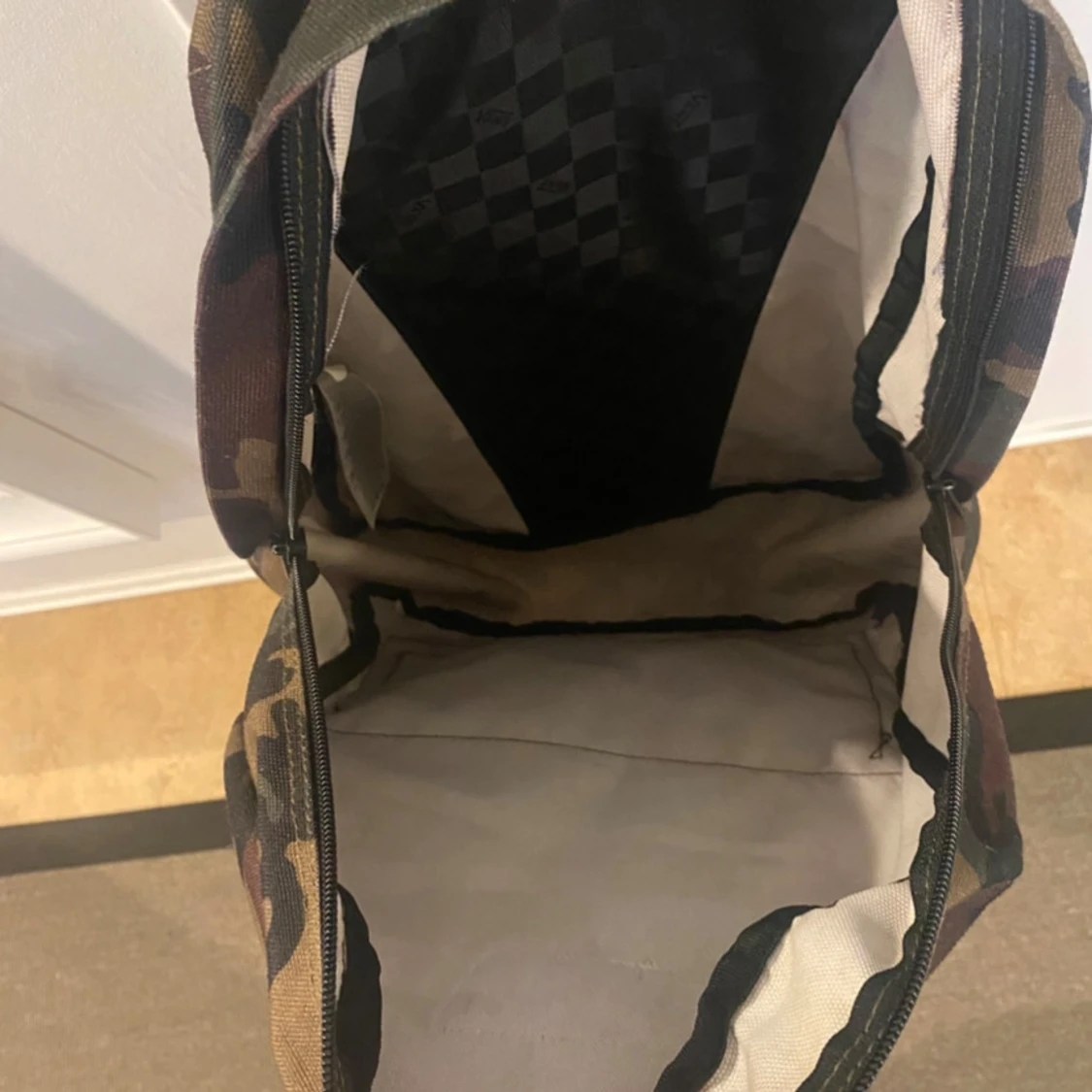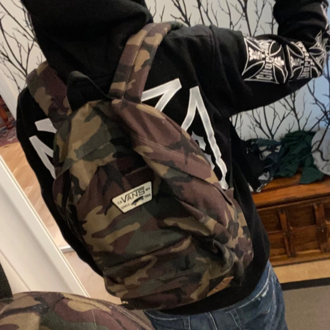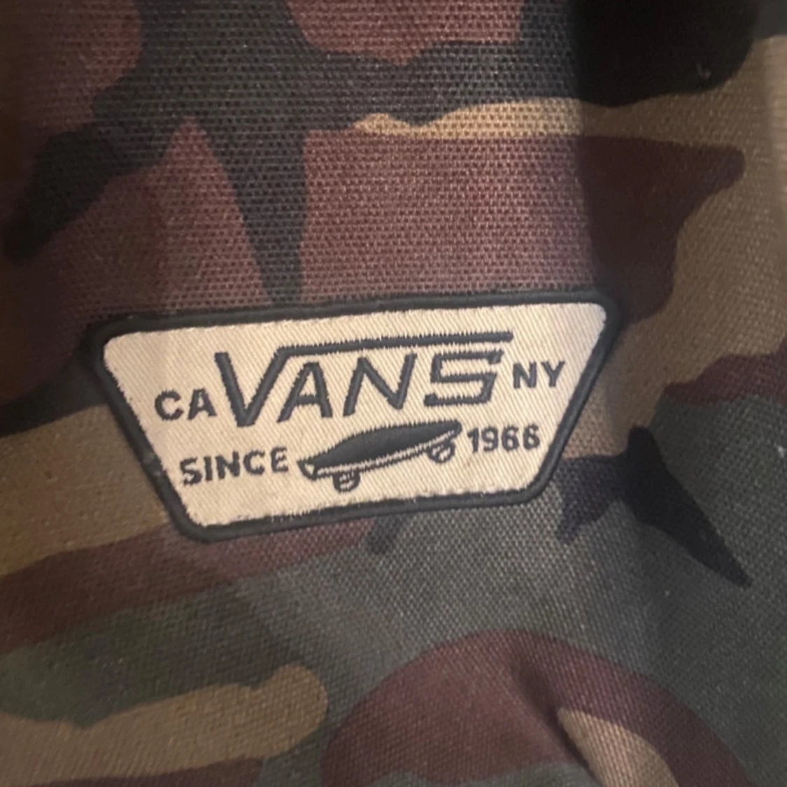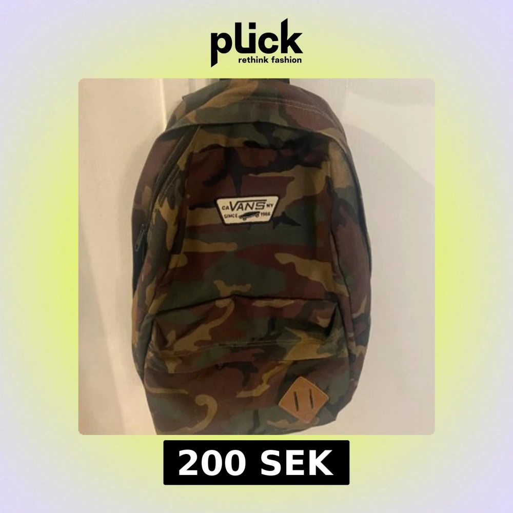 Säljer en klassisk ryggsäck från Vans i camouflage-mönster med gröna, bruna och svarta toner. Väskan har ett stort huvudfack, innerficka med dragkedja och en mindre ytterficka. Tillverkad i slitstark polyester och prydd med Vans-logga framtill.
