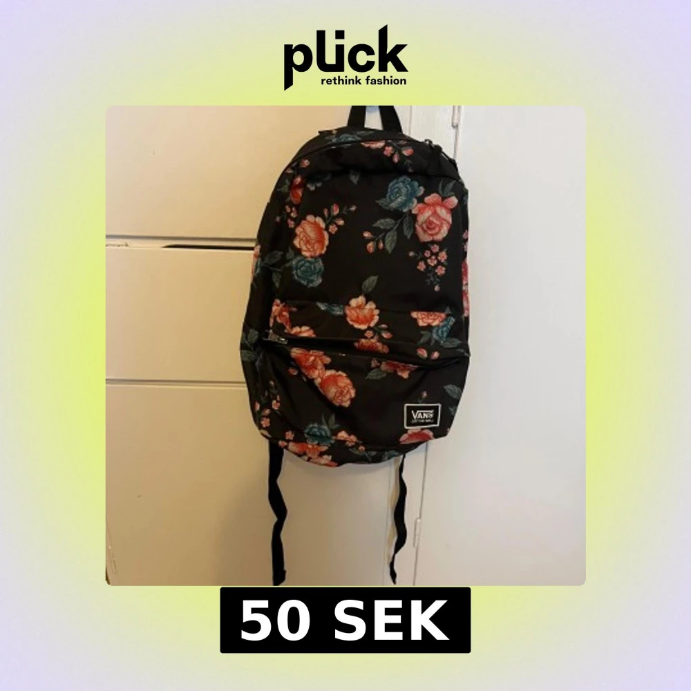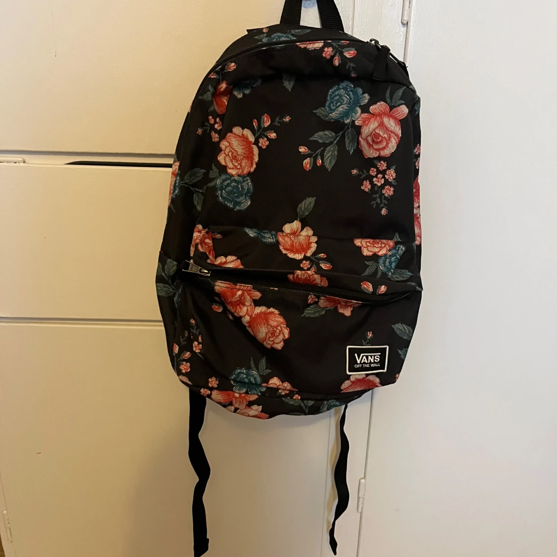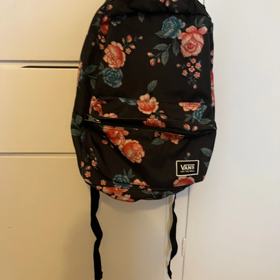 Säljer en snygg ryggsäck från Vans med ett blommigt mönster i rosa och grönt på svart bakgrund. Ryggsäcken har en praktisk dragkedja och justerbara axelremmar. Perfekt för att ge din stil en färgglad touch!