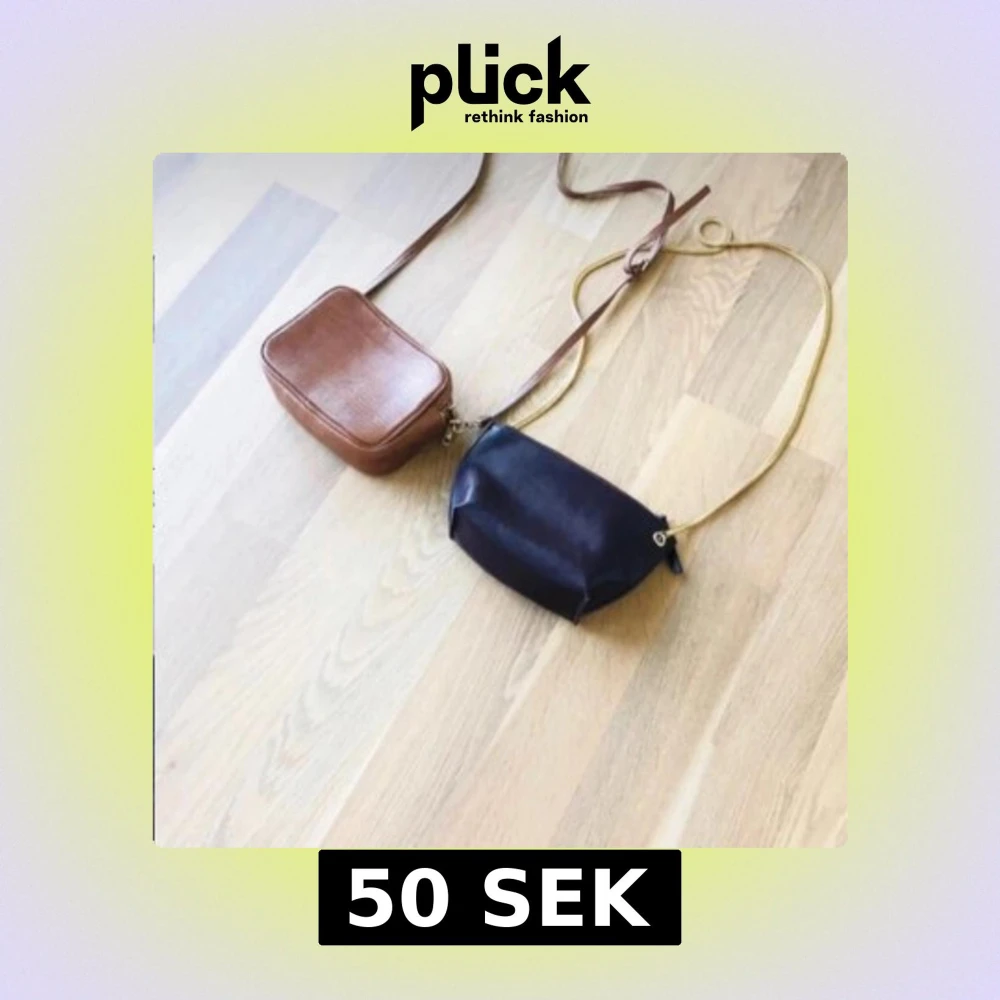 Säljer två stilrena axelväskor. Den ena är svart med guldfärgad kedja och slät yta, den andra är brun med fyrkantig form och präglat mönster som påminner om ormskinn. Båda har dragkedja och justerbara axelremmar. Perfekta för att bära det viktigaste. Den bruna har tappat lite färg men är väldigt vacker.