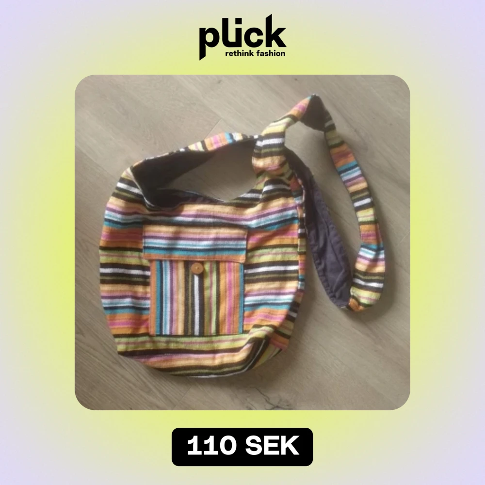 Vintage tygväska i jättebra skick. Slitstarkt vävt yttertyg. 3 fickor: en ytter och en inner + liten ficka i axelremmen. Väskans öppning stängs med dragkedja. Mått : 26 cm lång 36 cm bred 10 cm djup (mätt i botten)