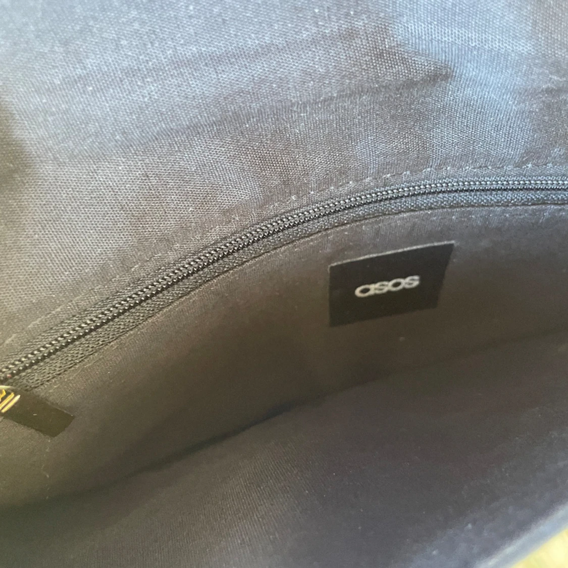 Kuvertväska från Asos. Använd två gånger, i fint skick! Ficka med dragkedja på insidan. På sista bilden kan man se ett par mindre fläckar. De syns knappt.