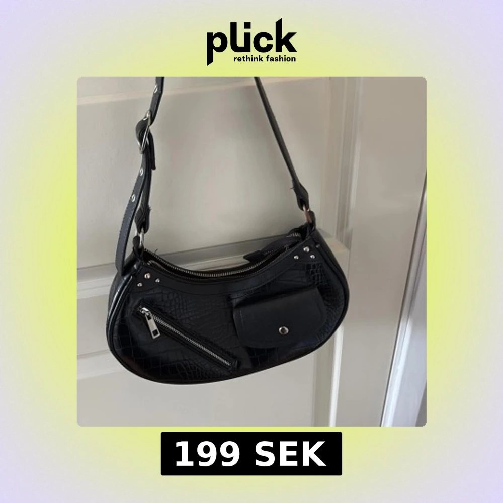 Snygg svart axelväska med krokopräglat mönster och silverfärgade detaljer. Väskan har en praktisk dragkedja och en ficka med knapp framtill. Perfekt storlek för det viktigaste och cool design som lyfter din outfit.