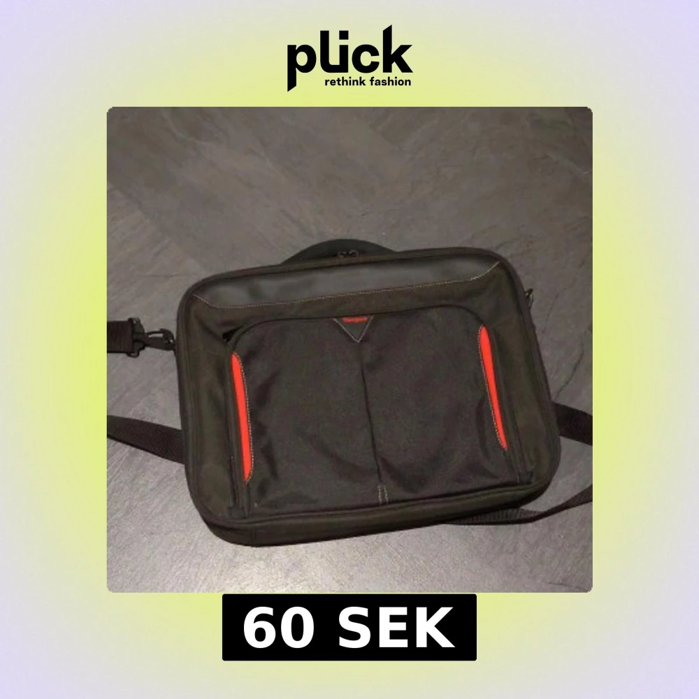 Praktisk svart datorväska från Targus med röda detaljer på framsidan. Väskan har flera fack för mobil, pennor och tillbehör, samt en justerbar axelrem. Insidan är organiserad med tydliga fack och elastiska band för USB och dokument. Katt finns i hemmet