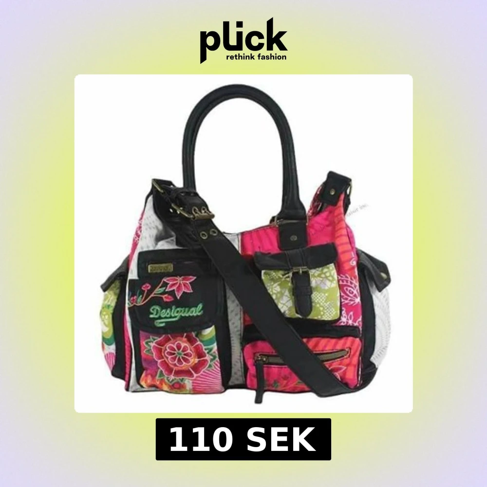 Färgstark axelväska från Desigual med blommigt broderi och flera praktiska fickor framtill. Väskan har svarta detaljer i skinnimitation, dragkedja upptill och justerbar axelrem. Mix av rosa, röd, vit och lila toner med coola mönster och broderade blommor. Axelremmen flagnar!