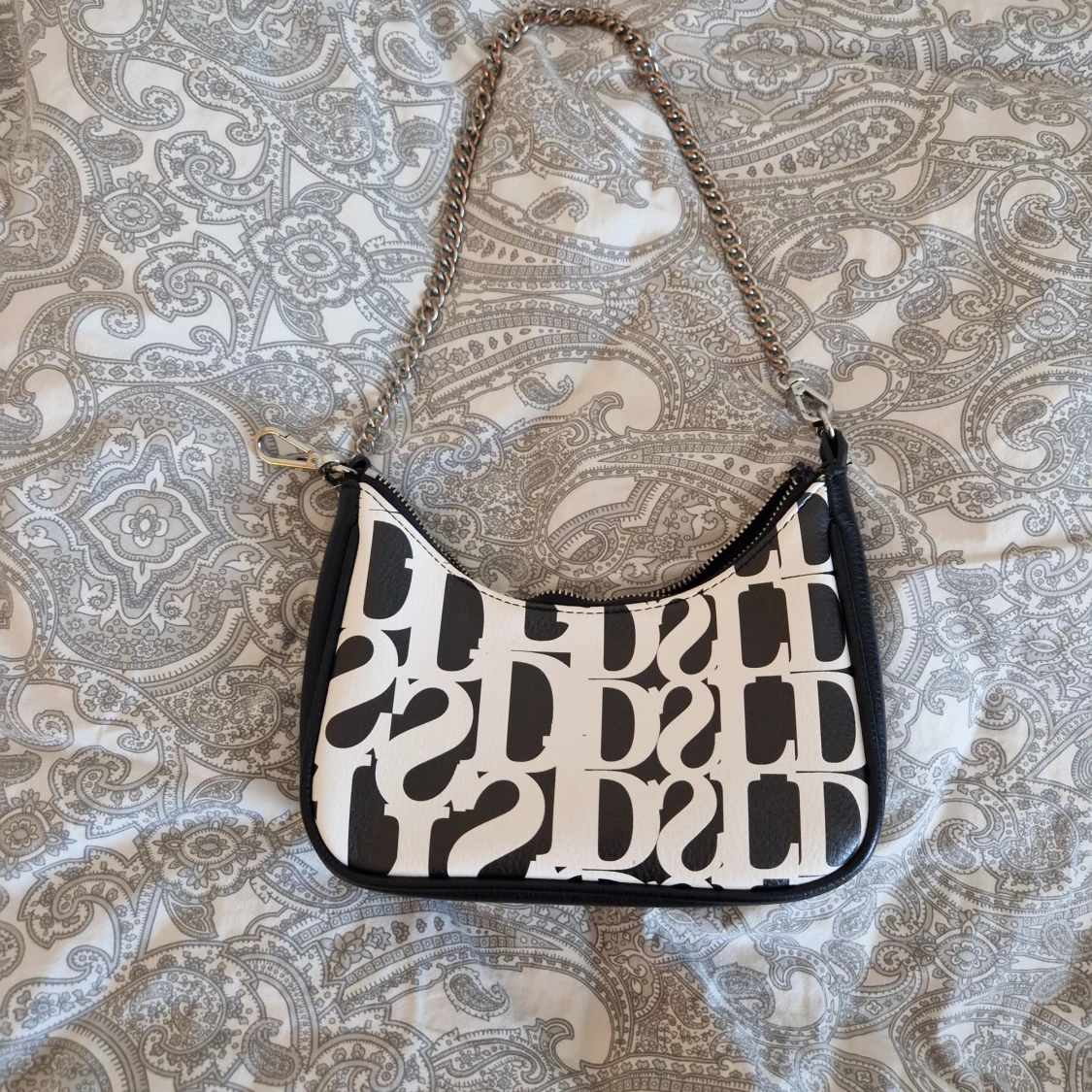 Säljer en snygg axelväska från Desigual i svart och vitt med grafiskt mönster och kedjerem. Väskan har dragkedja upptill och innerfack med ytterligare dragkedja. Perfekt storlek för det viktigaste och ger en cool statement-look. Dragkedjan är trasig med går absolut att laga!
