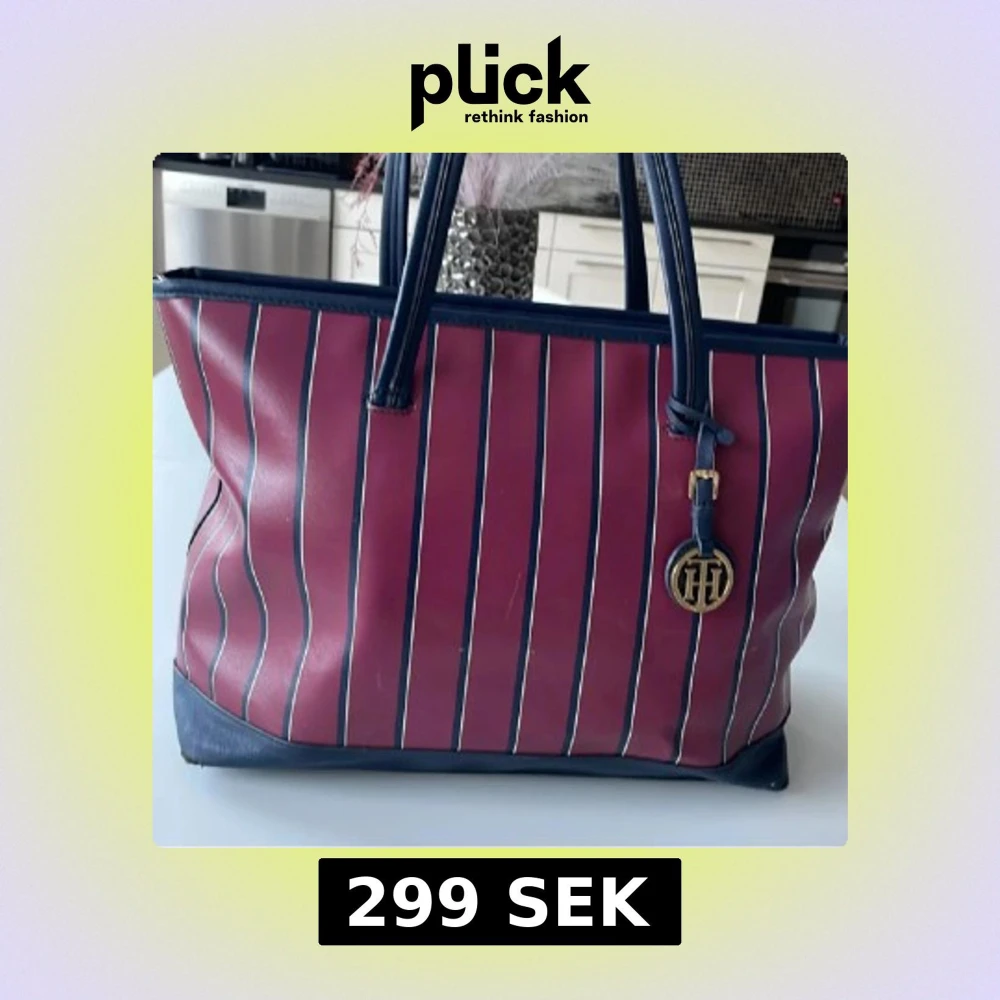 Snygg shoppingväska från Tommy Hilfiger i vinrött och marinblått med smala vertikala ränder.