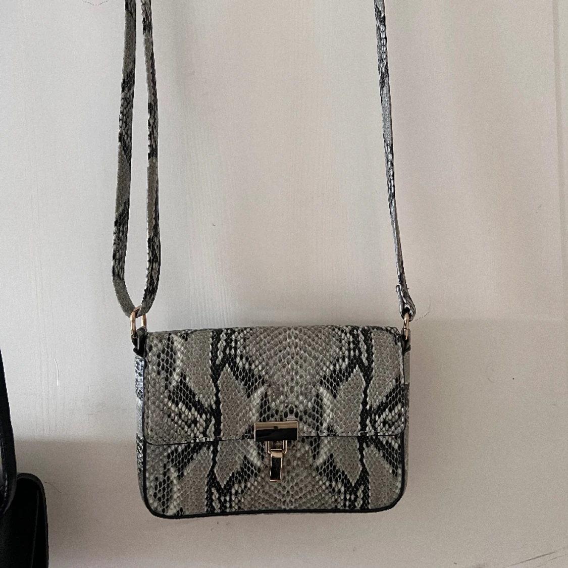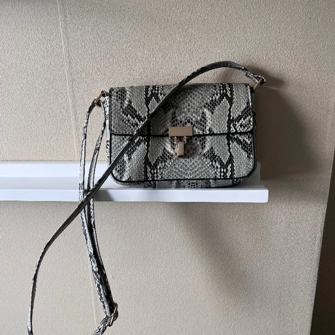 En liten väska i ormmönster med guldiga detaljer. Från glitter