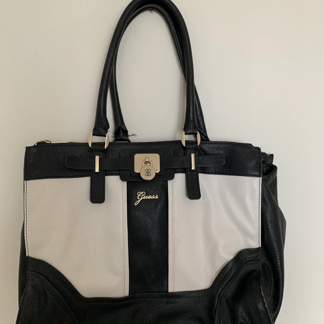 En svart, vit och guldig väska från märket Guess. Köpt i en Guess butik och säljer pågrund av att jag aldrig använt den. Den är stor och har många fack, man får plats med en dator i den plus massa block.🌸💖 Vid intresse kontakta gärna, frakt ingår i priset🥰