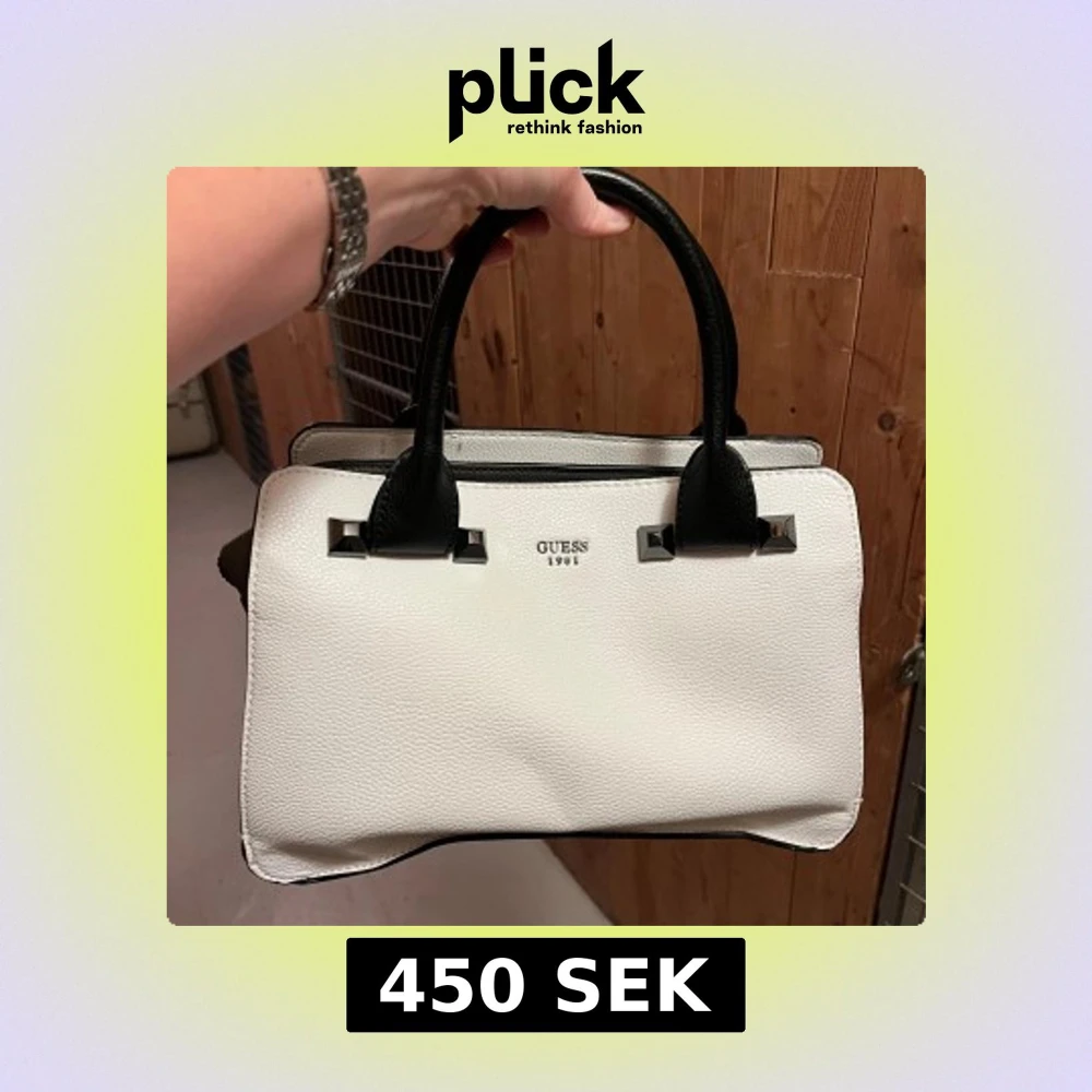 Snygg handväska från Guess i vit, grå och svart med stilrena detaljer i silver. Väskan har två rejäla handtag, strukturerad form och flera fack inuti för smart förvaring. Materialet är skinnimitation med en lyxig känsla och coola metallnitar framtill.