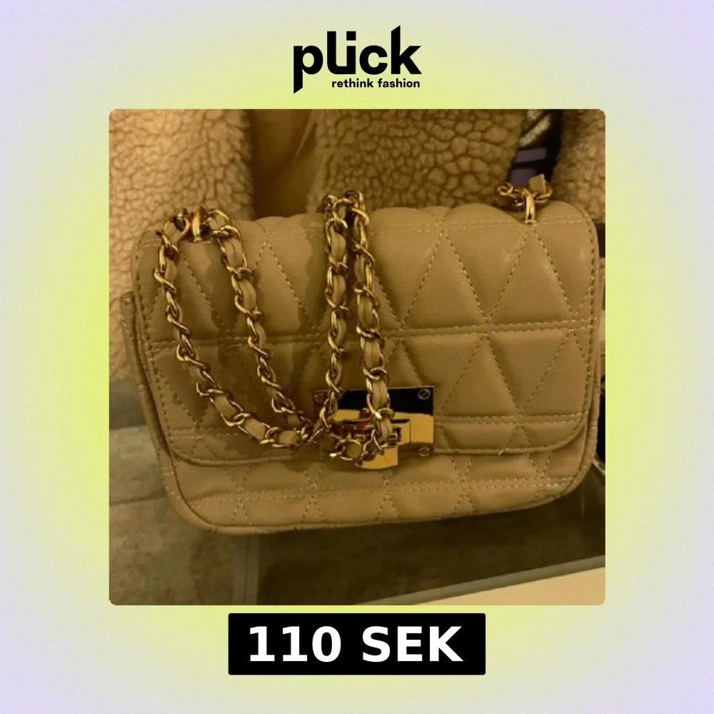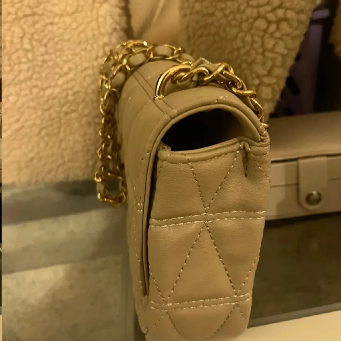 Snygg beige axelväska med quiltat mönster och guldfärgad kedja som axelrem. Väskan har en rektangulär form och ett stilrent lås i guld på framsidan. Materialet är skinnimitation och insidan har ett praktiskt fack för småsaker.