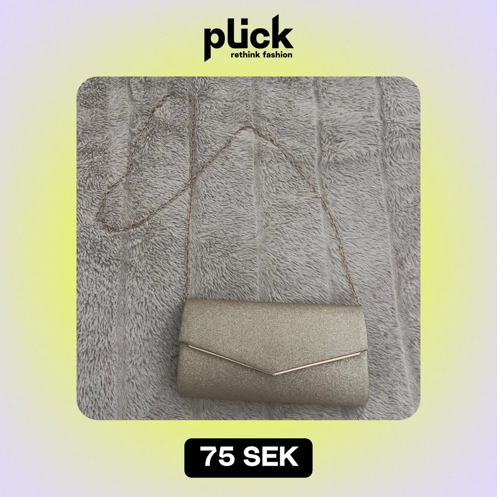 Säljer en superfin glittrig guld kuvertväska med kedja. Perfekt för fest, eller för att pimpa upp en vardaglig outfit. Den har en magnetisk knappstängning och en snygg design med en liten ficka inuti. Väskan är använd 1 gång.