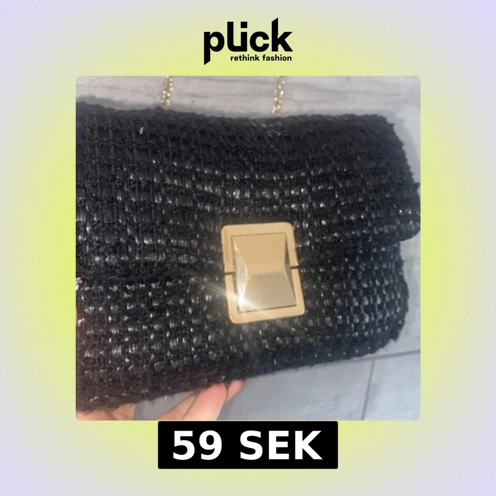 Stilren svart axelväska i vävt tyg med snyggt guldigt spänne framtill och matchande guldfärgad kedja som axelrem. Väskan har en klassisk rektangulär form och är perfekt för att lyfta din outfit med en elegant touch.