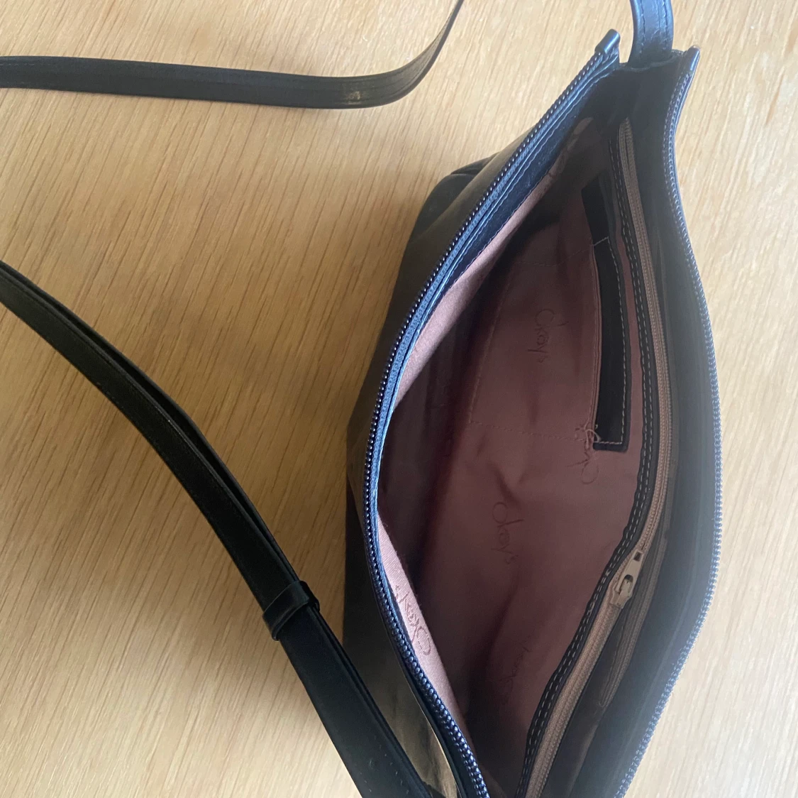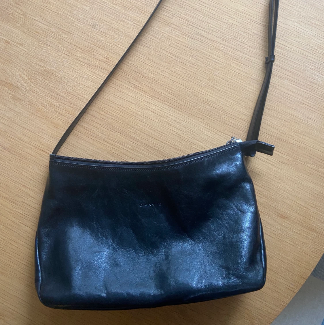 Praktisk svart axelremsväska i skinn i bra kvalité och storlek med flera fack!