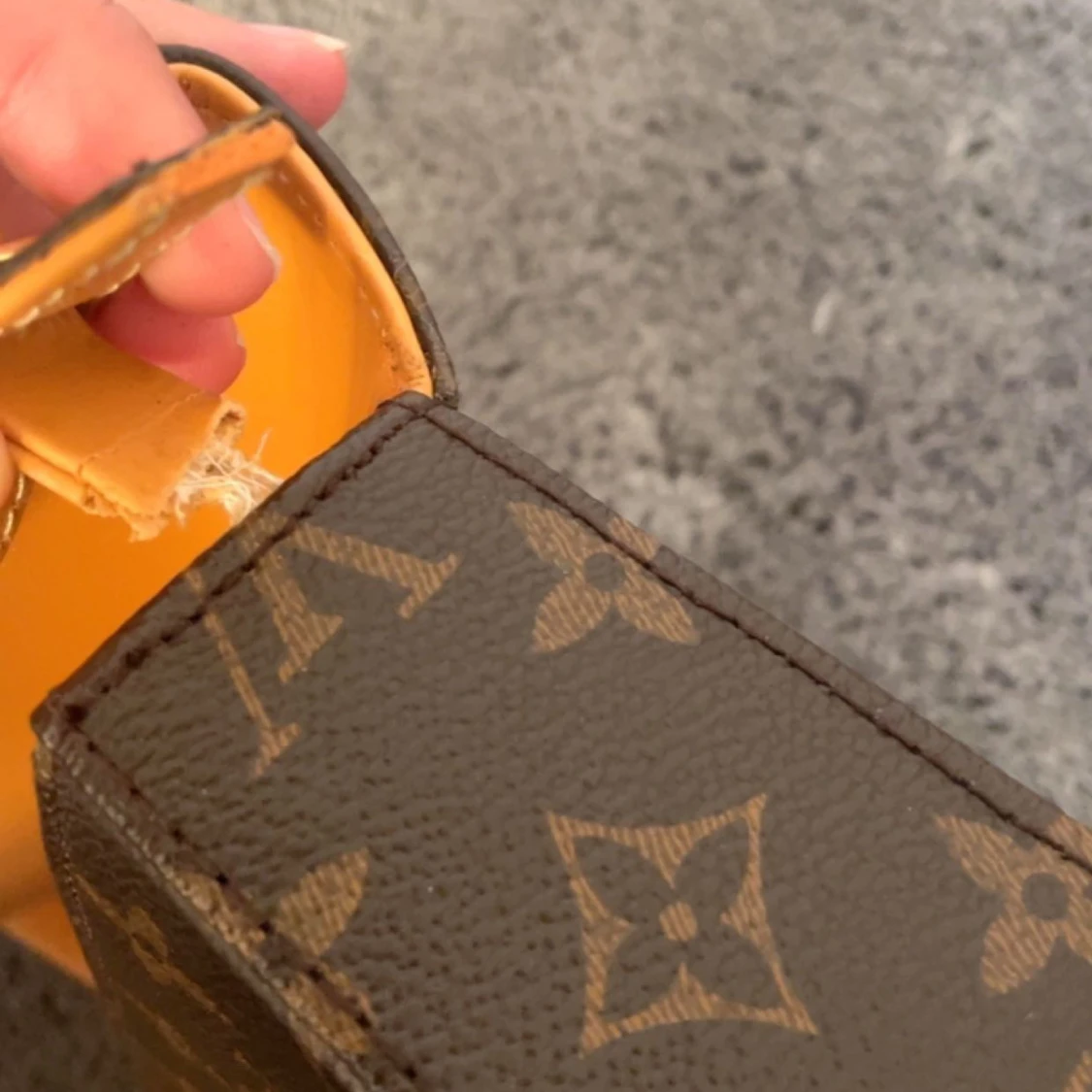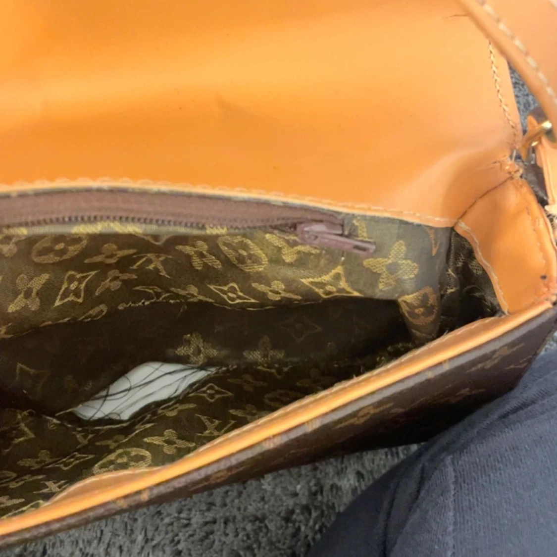 väska som är köpt second hand, vet inte om den är äkta. Tyvvär så är den trasig vilket syns på bild 2 och 3 därav det låga priset. Det går nog att laga den genom att sy några stygn💗