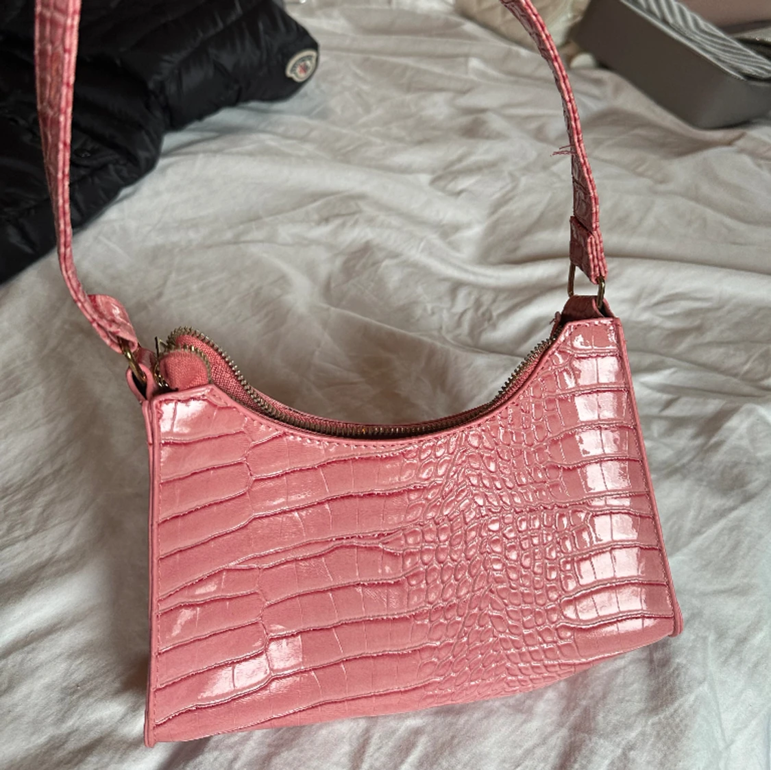 Söt handväska i en fin rosa färg med krokodil inspirerat mönster. Minns inte vart den är köpt tyvärr. Aldrig använd så i perfekt skick.
