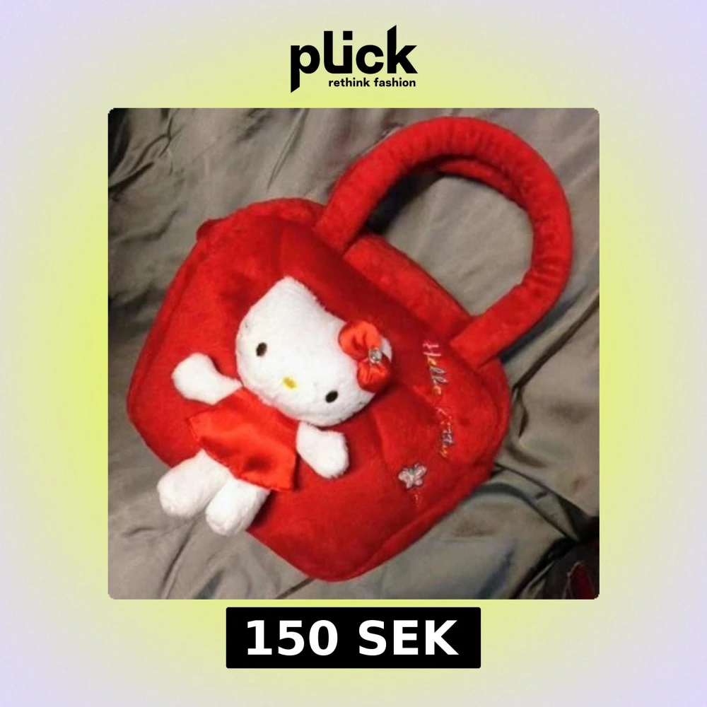 Mått 22*18*5cm. Supergullig röd handväska i mjuk plysch med Hello Kitty-figur framtill, klädd i röd klänning och rosett med strass. Broderad text och liten fjäril på framsidan. Perfekt för dig som vill sticka ut med en söt accessoar.9