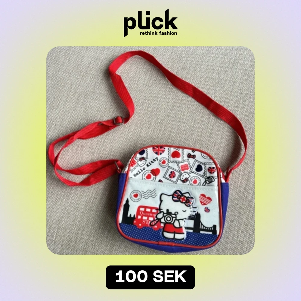 Söt liten väska med motiv av Hello Kitty Globetrotter collection -UK Färger röd, vit och blå. Justerbar axelrem. Storlek ca 17x16 cm. Ett fack som stängs med dragkedja.
