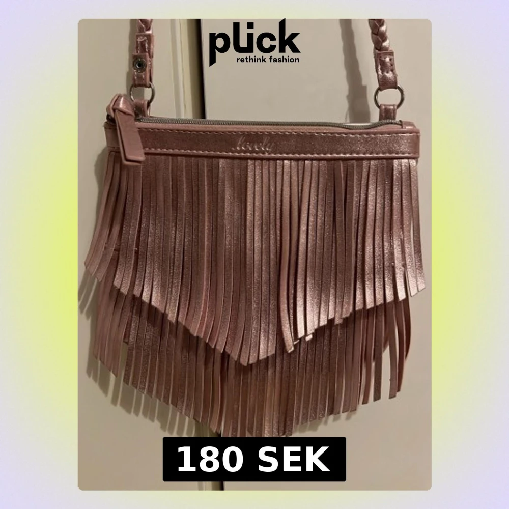 Snygg rosa axelväska från H&M med glansig finish och långa fransar framtill. Väskan har en flätad axelrem och stängs med dragkedja. Perfekt storlek för det viktigaste och ger en cool touch till din outfit.