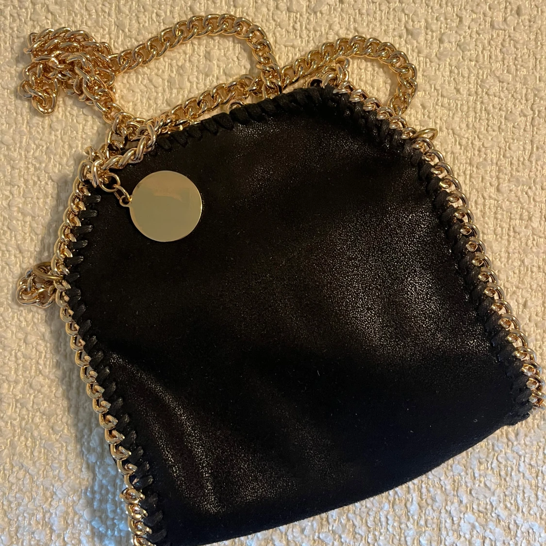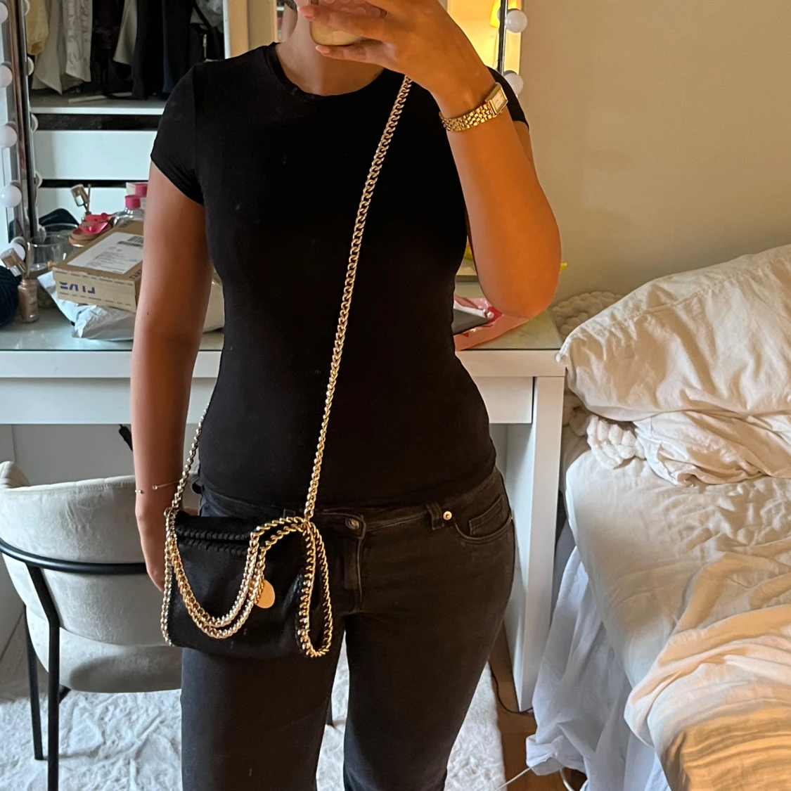 Säljer en svart axelväska med snygga guldfärgade kedjedetaljer runt kanterna och som axelrem. Stella mccartney liknande!