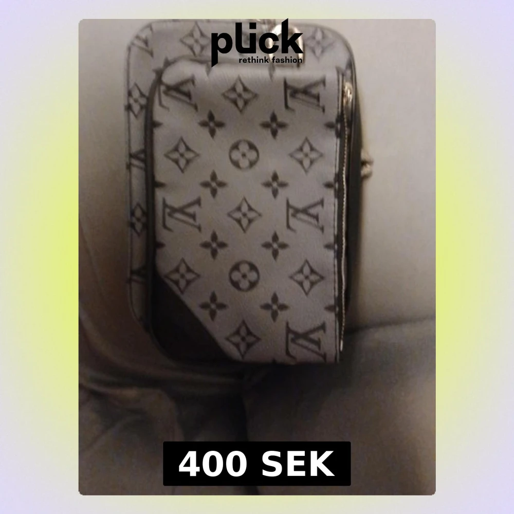 Snygg datorväska från i grått med klassiskt monogrammönster. Väskan har en rektangulär form, dragkedja och detaljer i svart skinn. Perfekt för dig som vill ha en stilren och lyxig accessoar till din laptop.