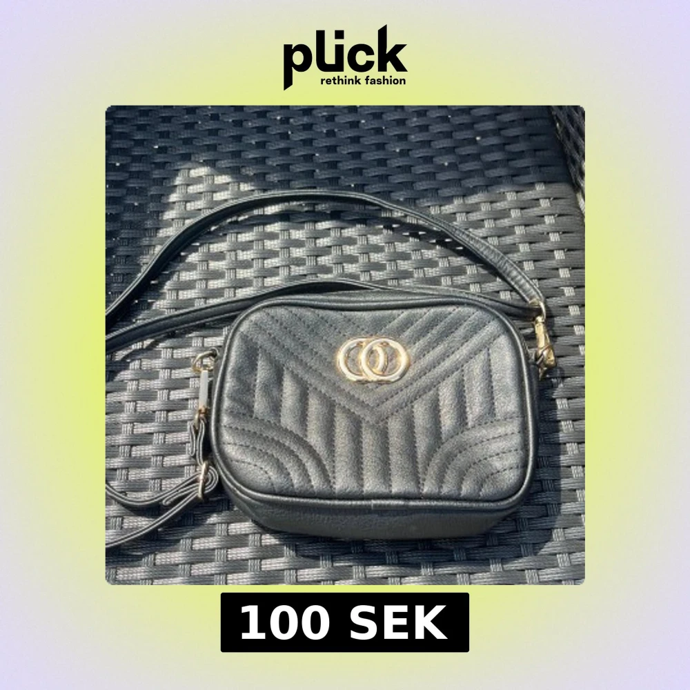 Snygg svart axelväska. Väskan har justerbar axelrem. Kommer tyvärr inte till användning. Mått: 20 cm lång, 15 cm hög.