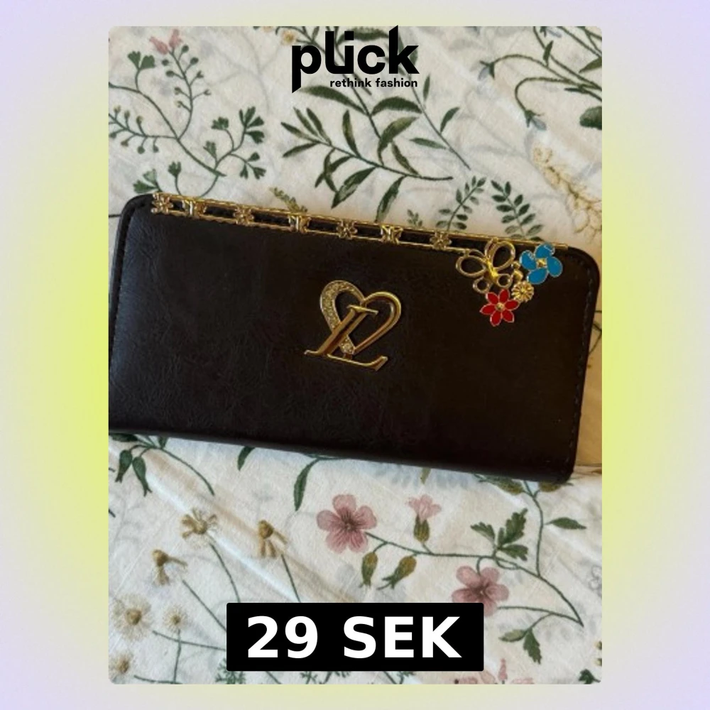 • Brun plånbok i skinn med guldfärgad dekor upptill och ett hjärtformat emblem på framsidan. • Plånboken har dragkedja med hjärtformad detalj och små blommor i guld samt färgglada blomcharms i hörnet. • Perfekt för kort och kontanter. • Är trasig på vissa ställen som det ses i bilderna.