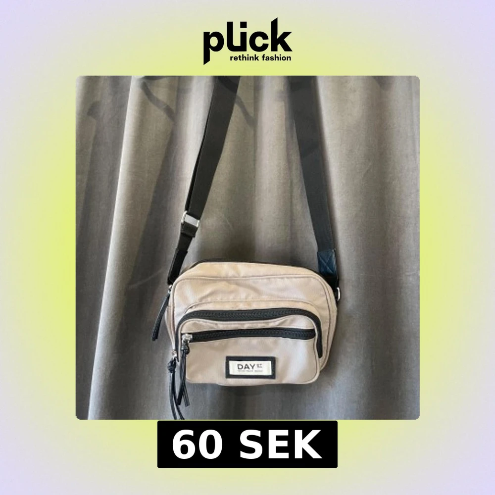 Snygg beige liten axelväska från DAY ET med justerbar svart axelrem. Väskan har flera dragkedjeförsedda fack för praktisk förvaring. Perfekt för att bära med sig det nödvändigaste på ett stilrent sätt.