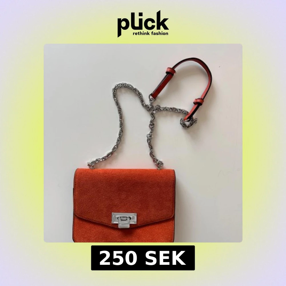 Säljer en snygg orange axelväska i mocka med silverfärgad kedjerem och metallspänne framtill. Väskan har en stilren, rektangulär form och är perfekt för att lyfta en outfit med lite färg. Aldrig använd