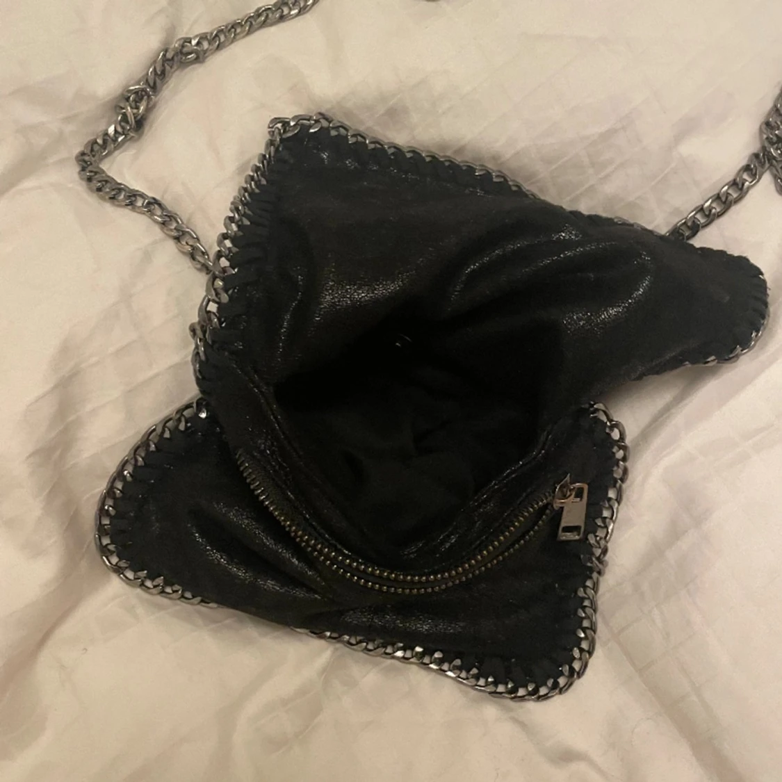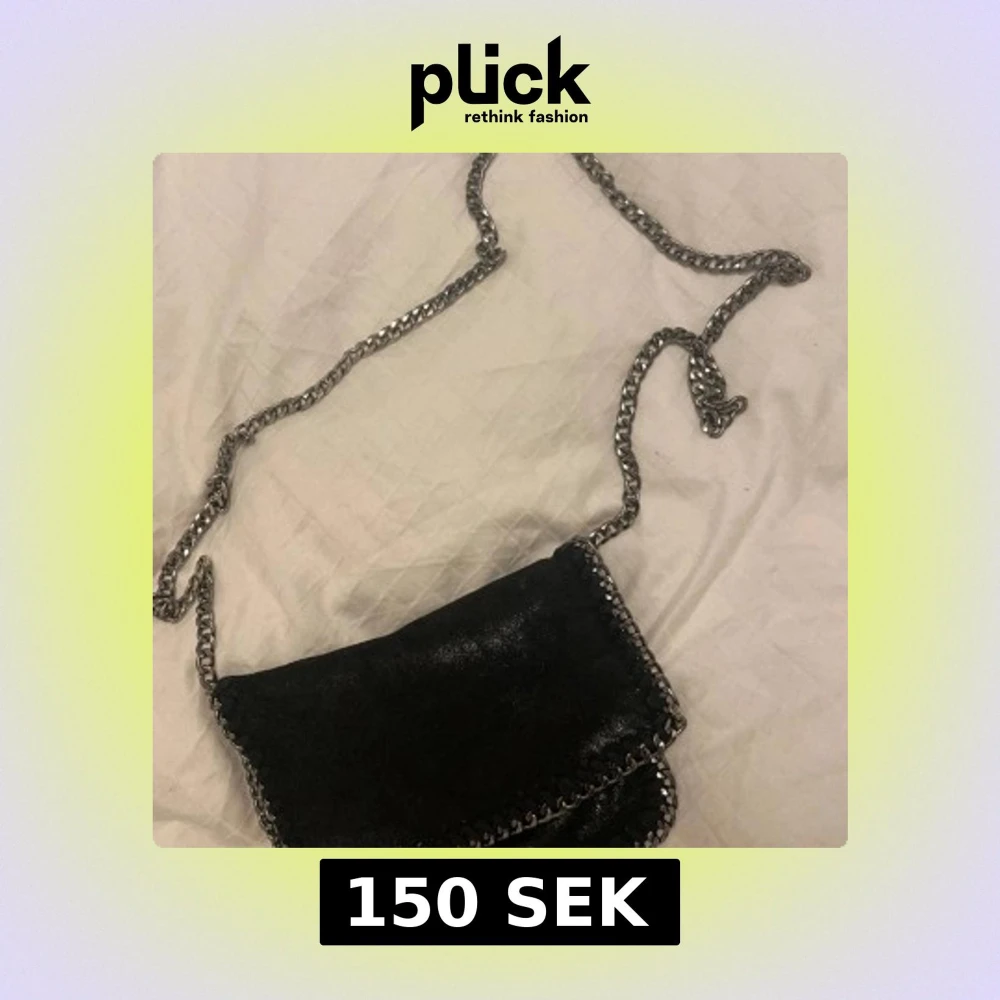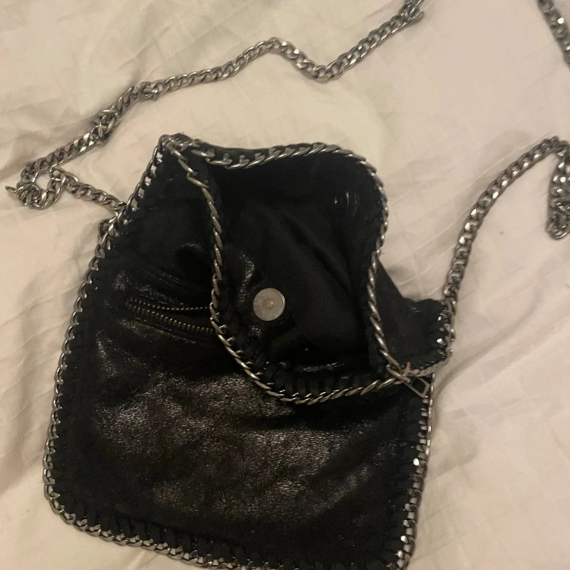 svart väska med silverkedja. köpt second hand så vet inte vilket märke det är. Använd men i jättefint skick😊