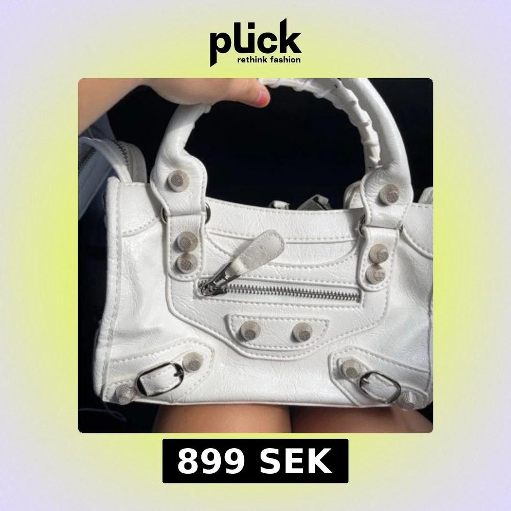 Snygg vit handväska i skinnimitation med coola silverfärgade detaljer och dragkedja framtill. Väskan har ett unikt designat handtag och flera dekorativa nitar. Perfekt storlek för att få plats med det viktigaste och passar till många olika stilar.