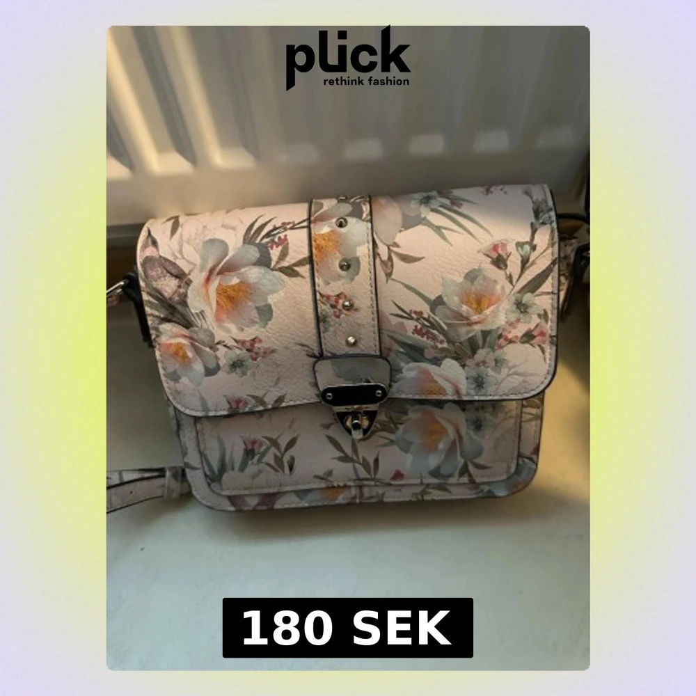 Säljer en superfin axelväska i ljus färg med blommigt mönster och fågelmotiv. Väskan har ett snyggt metallspänne framtill och justerbar axelrem.