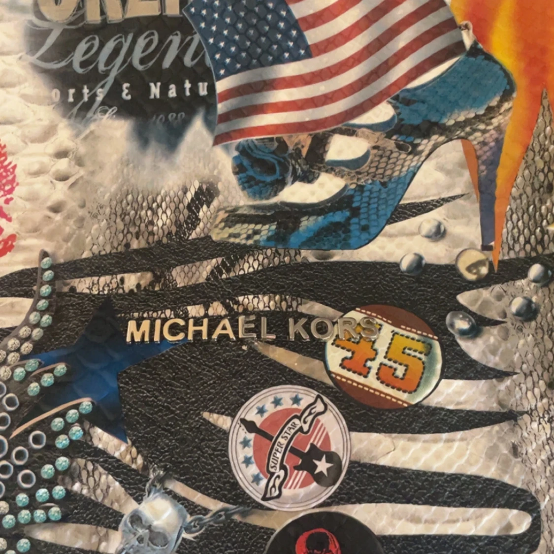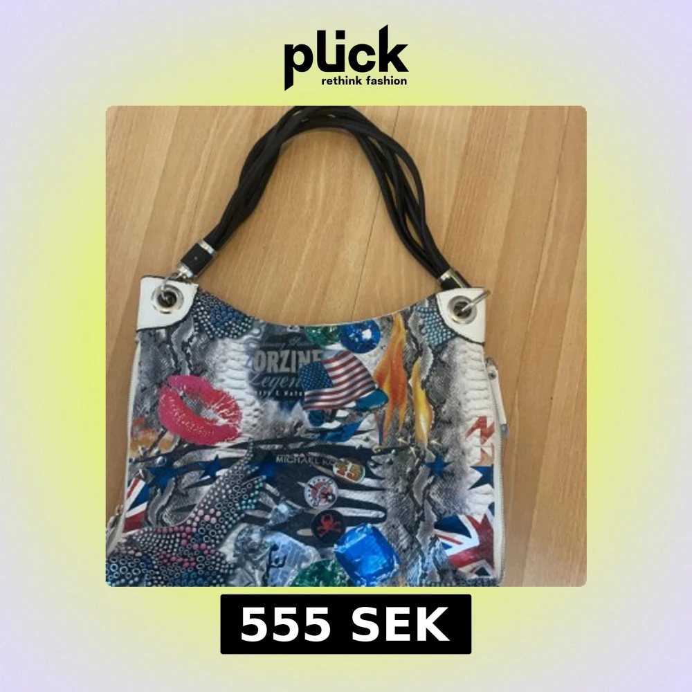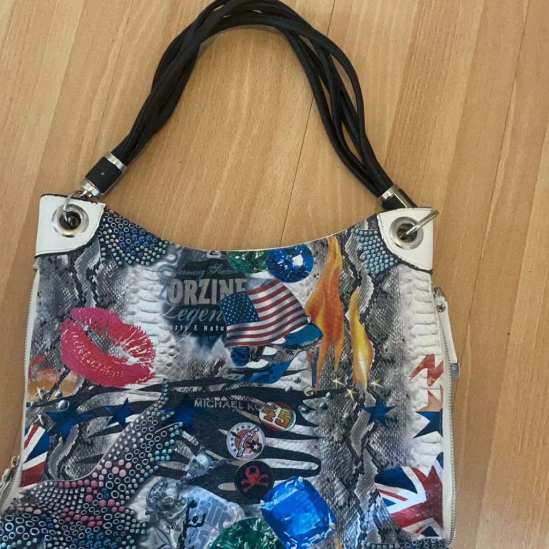 Säljer en unik och färgglad handväska från Michael Kors med ett coolt collage av flaggor, läppar och andra mönster. Väskan har svarta handtag och en praktisk dragkedja på sidan. Perfekt för dig som vill sticka ut! 👜✨
