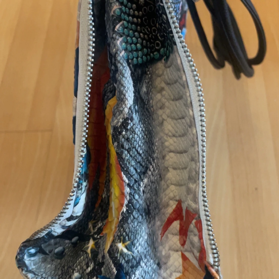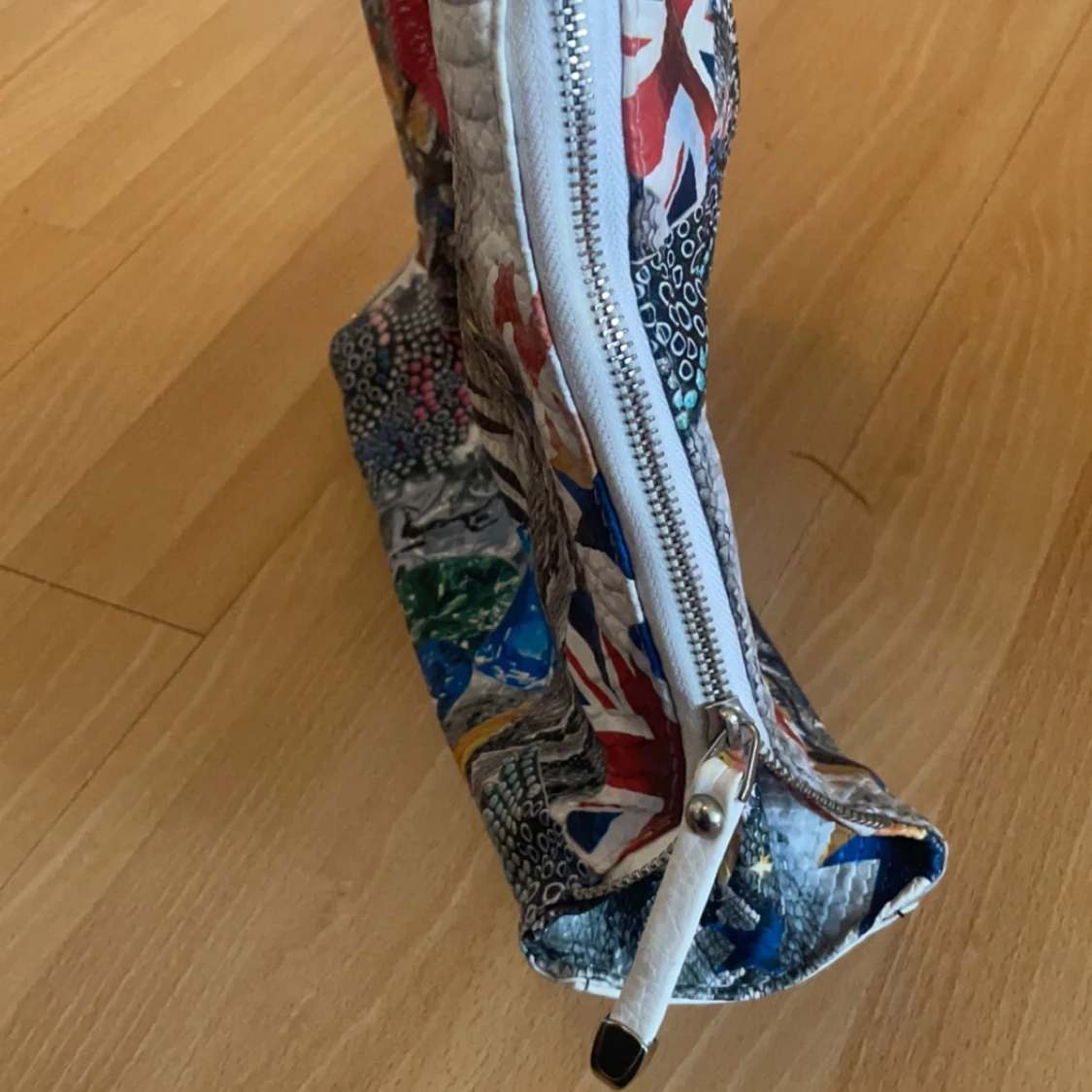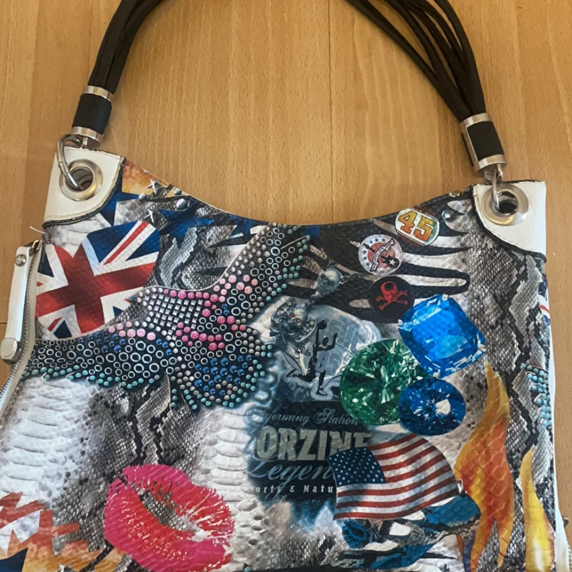 Säljer en unik och färgglad handväska från Michael Kors med ett coolt collage av flaggor, läppar och andra mönster. Väskan har svarta handtag och en praktisk dragkedja på sidan. Perfekt för dig som vill sticka ut! 👜✨