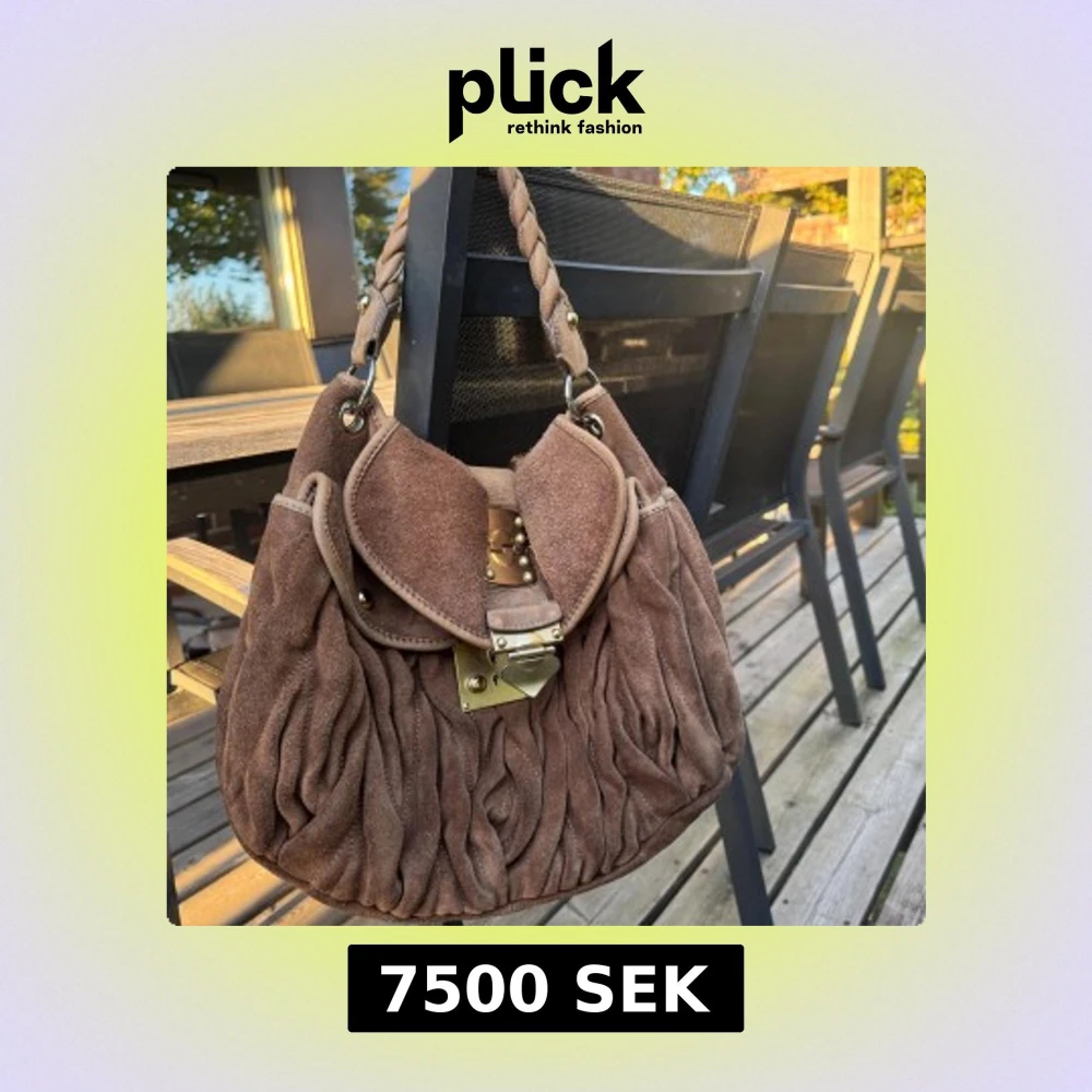 Säljer en brun axelväska från Miu Miu i mjuk mocka med snyggt rynkad design och flätat handtag. Väskan har guldfärgade metalldetaljer och ett coolt lås framtill. Äkta från vestire collective