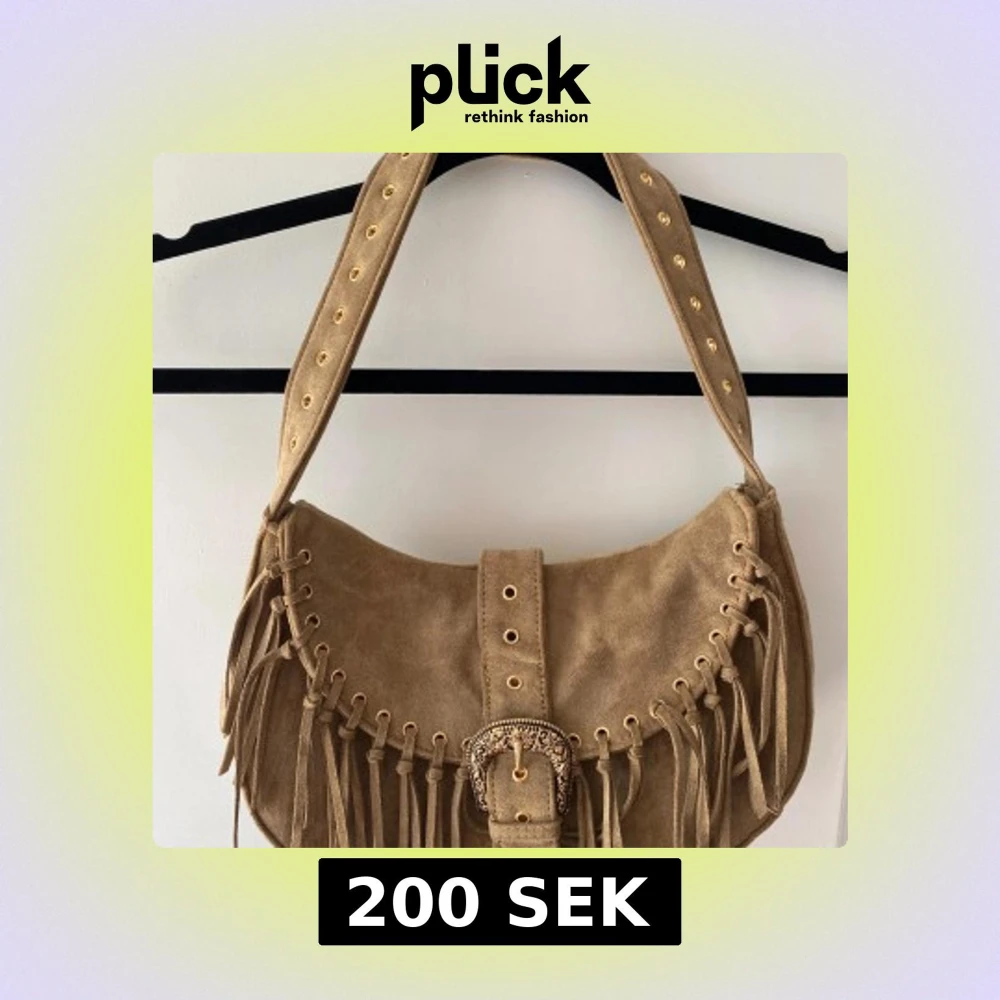 Säljer en beige axelväska i mocka med snygga fransar och guldfärgade detaljer. Väskan har en bred axelrem med nitar och en dekorativt mönstrad spännesdetalj framtill. Perfekt för dig som gillar boho-stil. Endast använd en gång en kort stund, som ny! köpt för 289kr