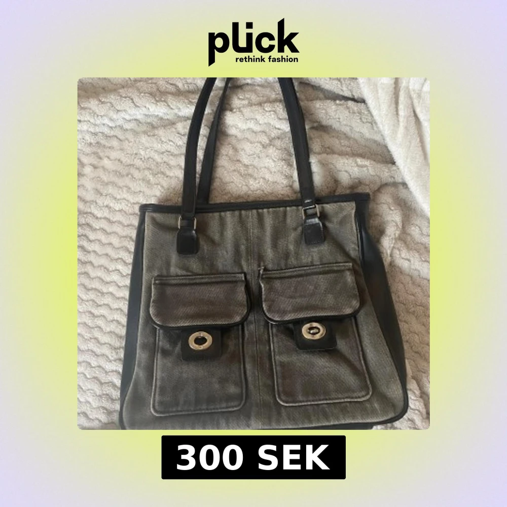 Snygg grå handväska med svarta detaljer och två stora fickor framtill med metallspännen. Väskan har långa svarta handtag och är tillverkad i en kombination av bomullstyg och skinn på sidorna och handtag. Perfekt för dig som vill ha plats för allt viktigt och gillar en stilren look.