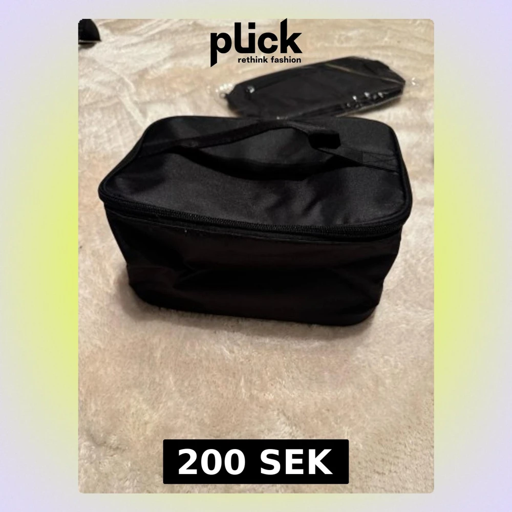 Praktisk svart necessär med rektangulär form och handtag på ovansidan. Väskan är tillverkad i syntetmaterial och har ett stort huvudfack samt en meshficka med dragkedja på insidan av locket. Perfekt för att organisera dina småsaker eller smink. Helt ny.
