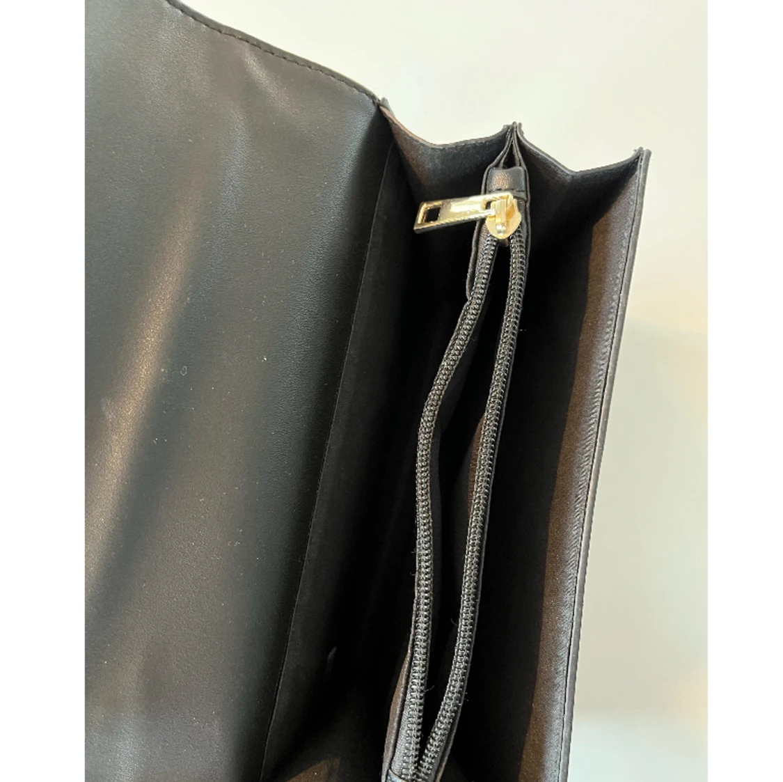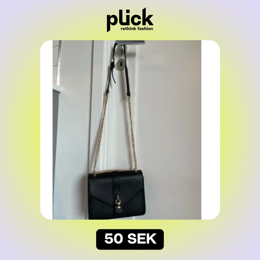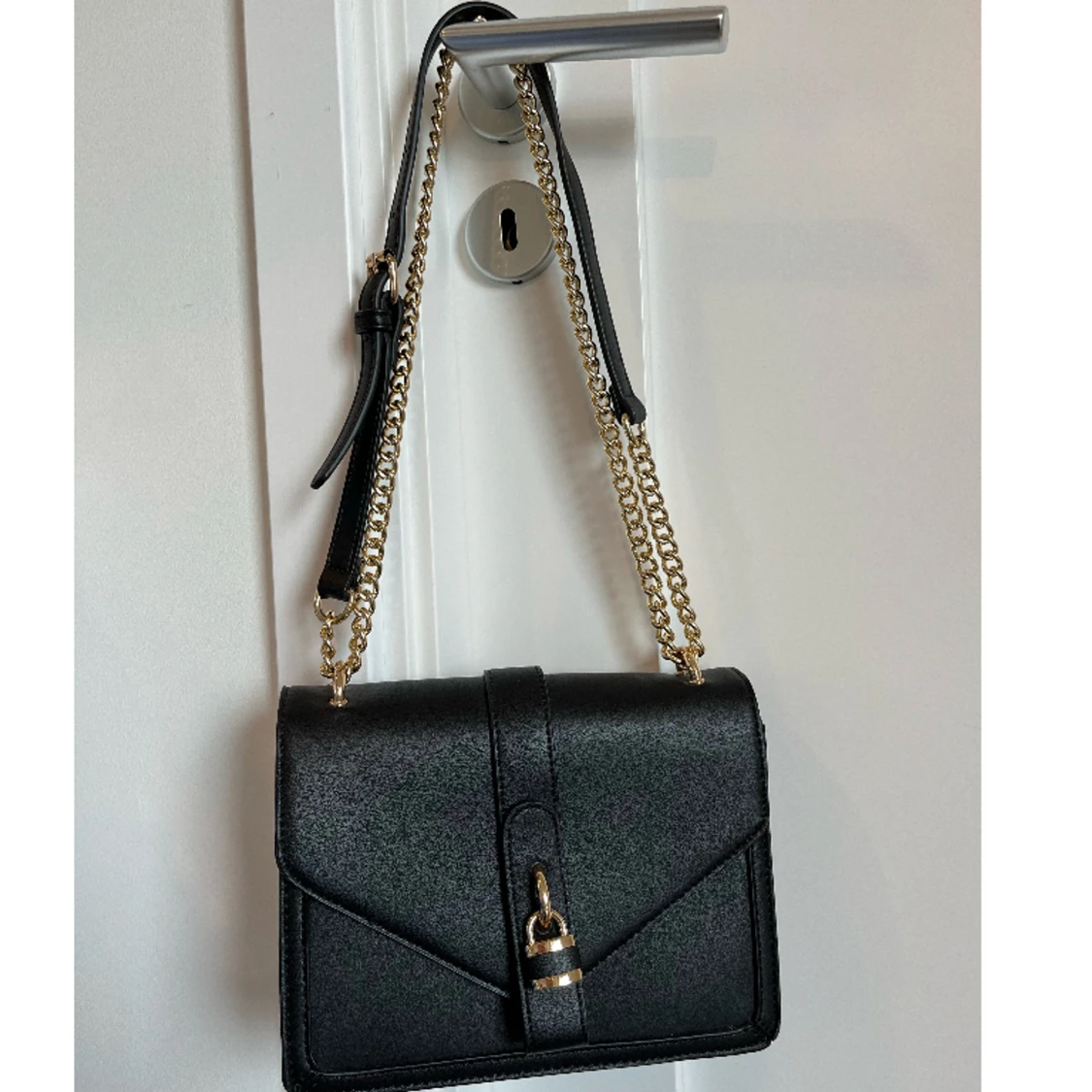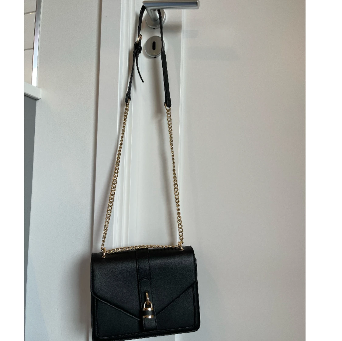 Svart väska med guldkedjor, hänglås på utsidan som dekoration. Ryms mycket inuti och går att använda bandet som långt eller kort. Tre fack inuti varav ett i mitten med dragkedja. Står inget märke. Nyskick.
