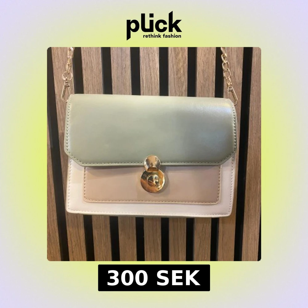 Snygg axelväska i tvåfärgad design med ljusgrönt lock och beige kropp. Väskan har en guldfärgad kedja och ett stilrent, runt spänne framtill. Perfekt för att lyfta din outfit med en trendig accessoar.