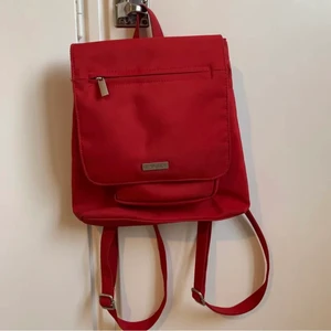 En mindre ryggsäck i röd färg. Har flertal fickor & fack.
