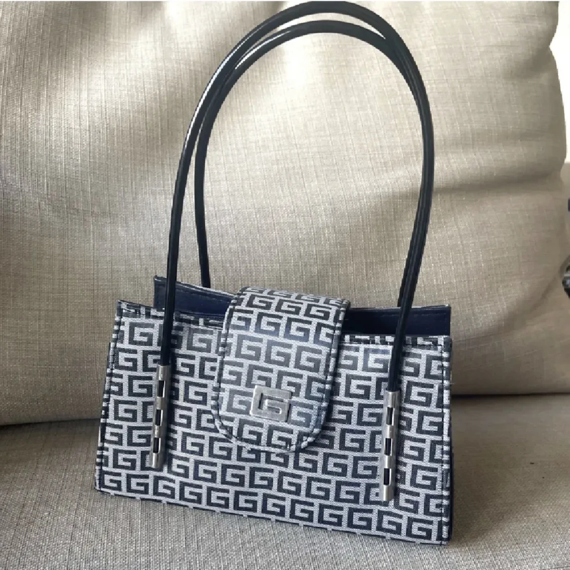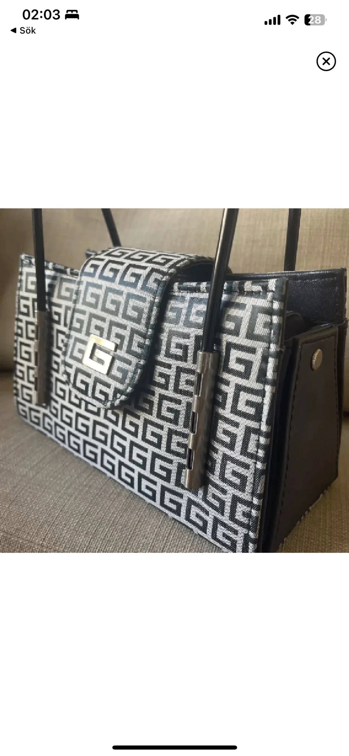 En supersöt handväska. Står av sig själv och är stadigt. Rymmer mycket för att vara en liten väska. Längd: 21cm Höjd: 12cm Bred: 10cm