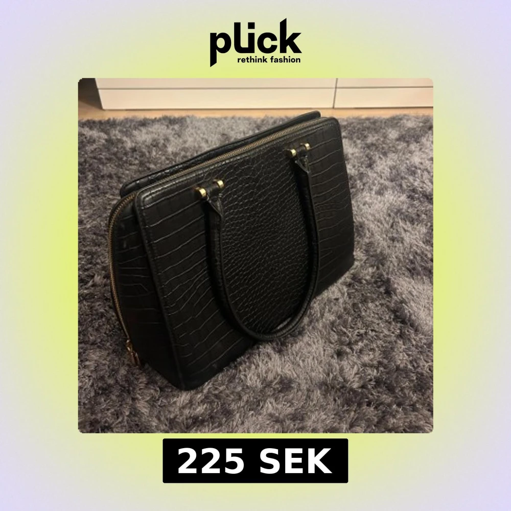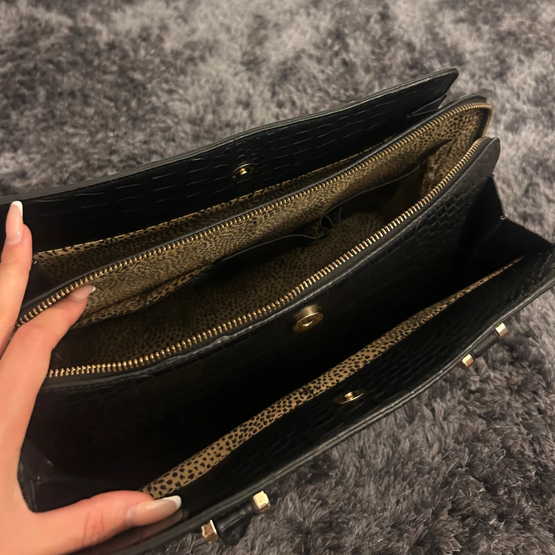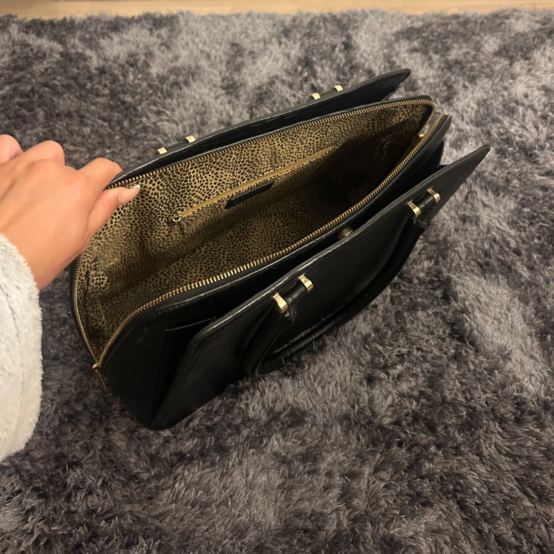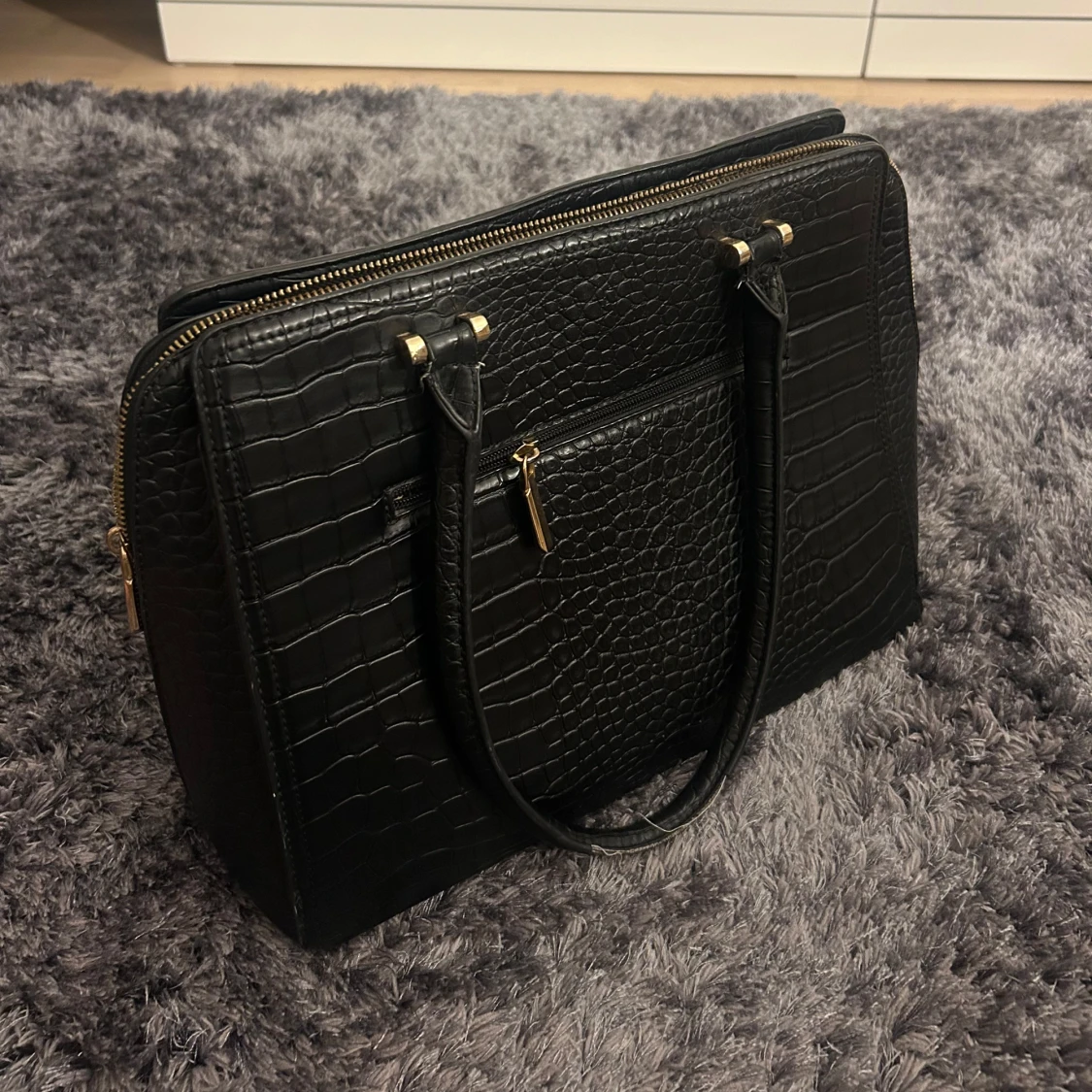 Snygg svart väska i croco-imitation med guldiga detaljer och dragkedjor. Väskan har flera fack och ett coolt mönstrat innerfoder. Perfekt för att bära laptop och allt du behöver till plugget eller jobbet.