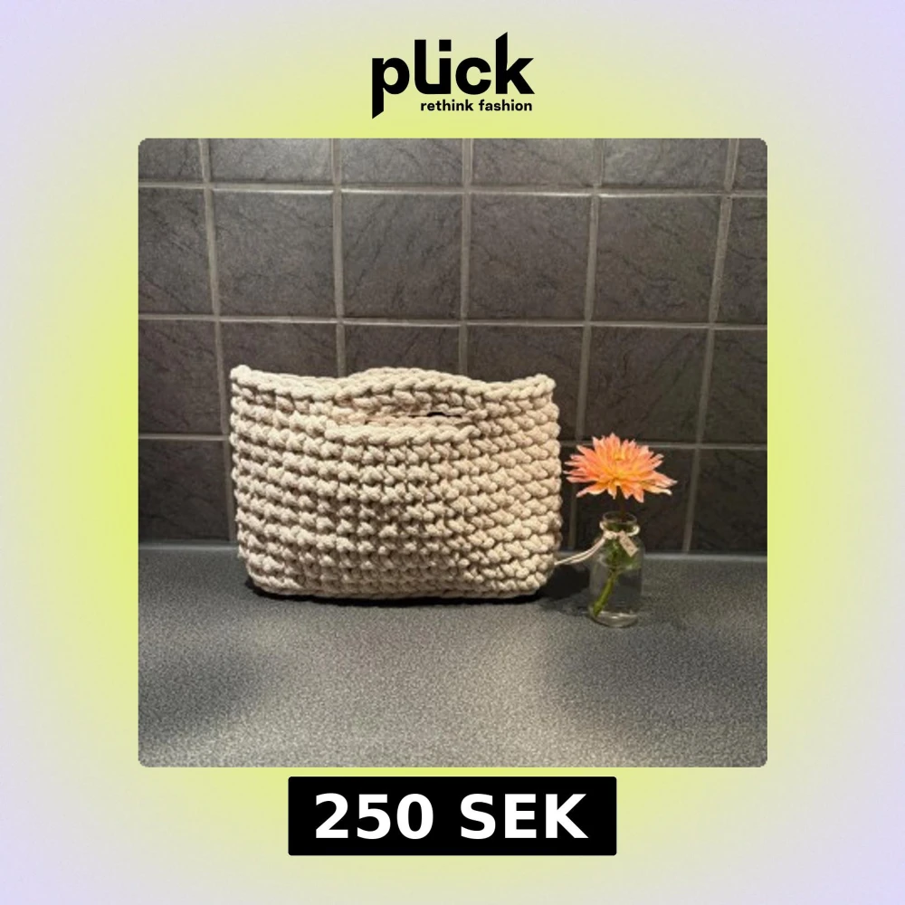 Säljer en beige, handgjord virkad handväska med grovt garn. Väskan har inbyggt handtag och är perfekt för att bära mobil och småprylar. Den är ca 25 cm bred och ca 16 cm hög.