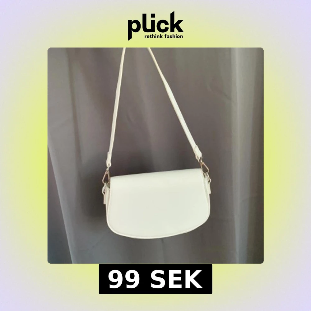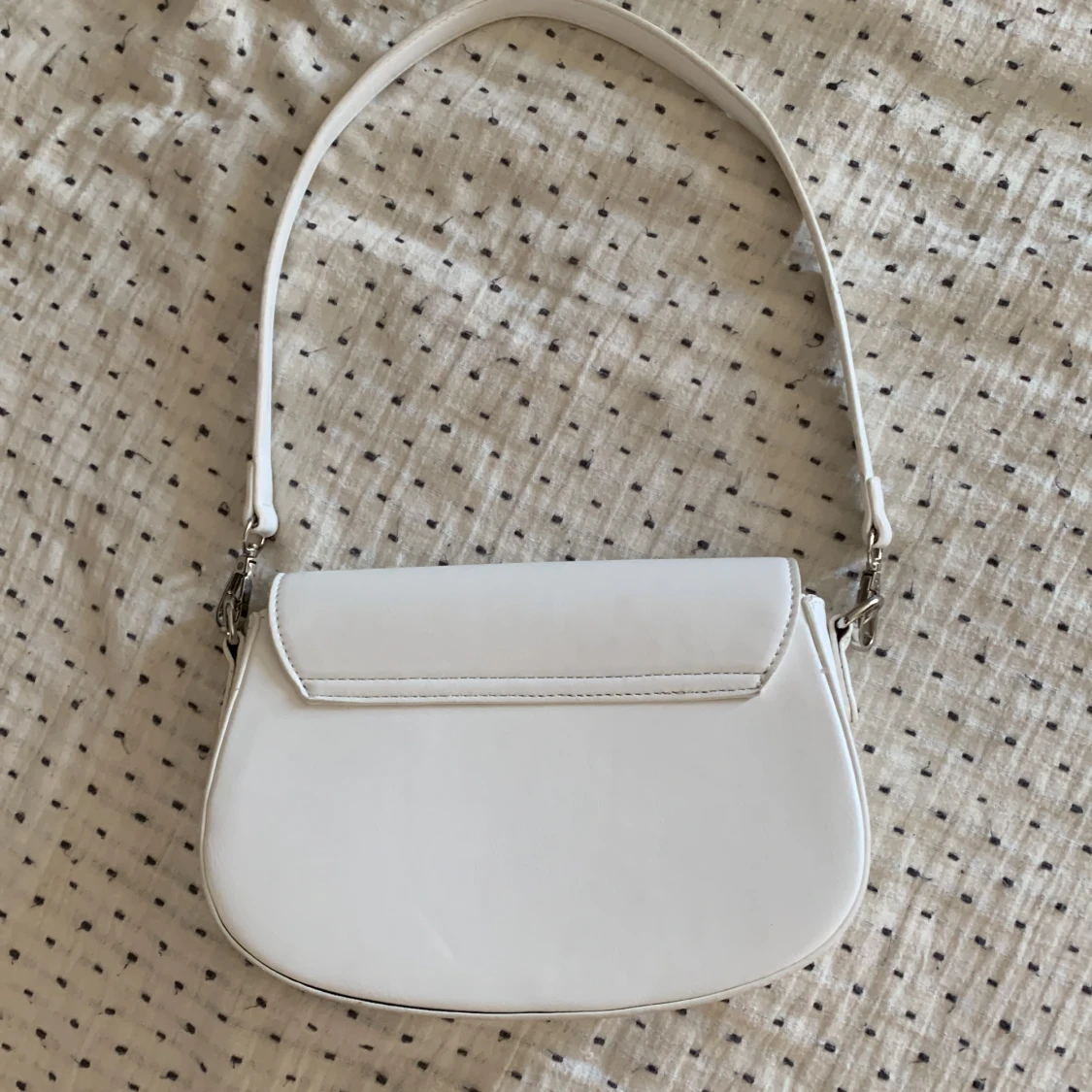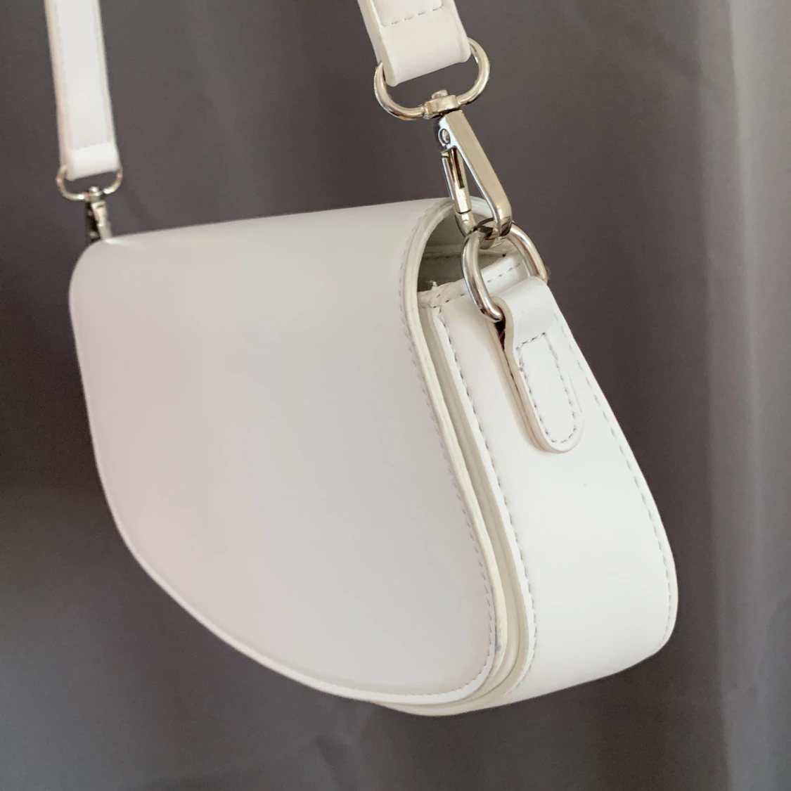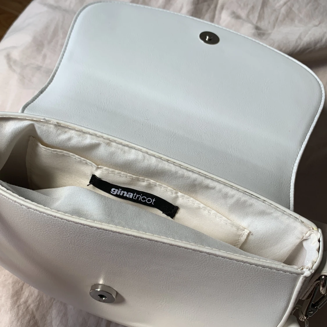 Stilren vit axelväska från Gina Tricot i syntetmaterial med silverfärgade metalldetaljer. Väskan har en avlång, rundad form och stängs med magnetknapp. Perfekt storlek för det viktigaste och enkel att matcha till olika outfits.