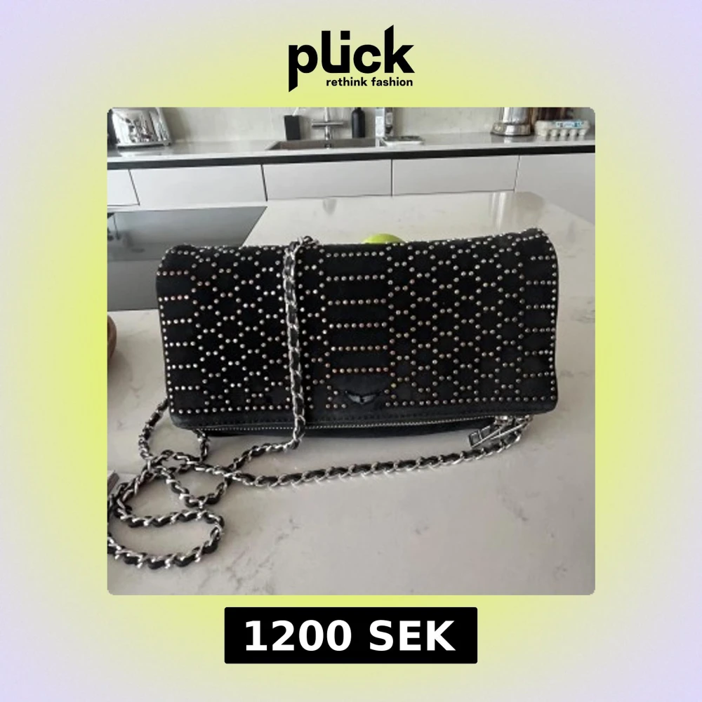 Snygg svart axelväska dekorerad med små nitar över hela ytan. Väskan har en kedjerem som ger en cool touch och en dragkedja för säker förvaring. Perfekt för att ge din outfit lite edge. Lite missfärgning på några nitar men syns inte så mycket. Pris kan diskuteras