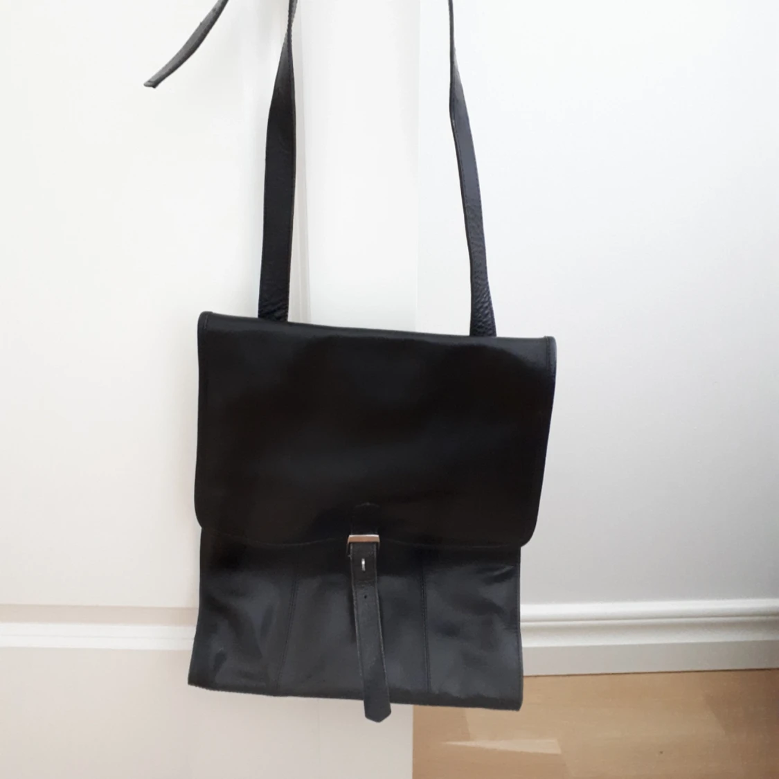 Svart läderväska med justerbart axelband. Remmen vid spännet är lite sliten annars i fint skick. Ett stort fack samt ett litet innefack.